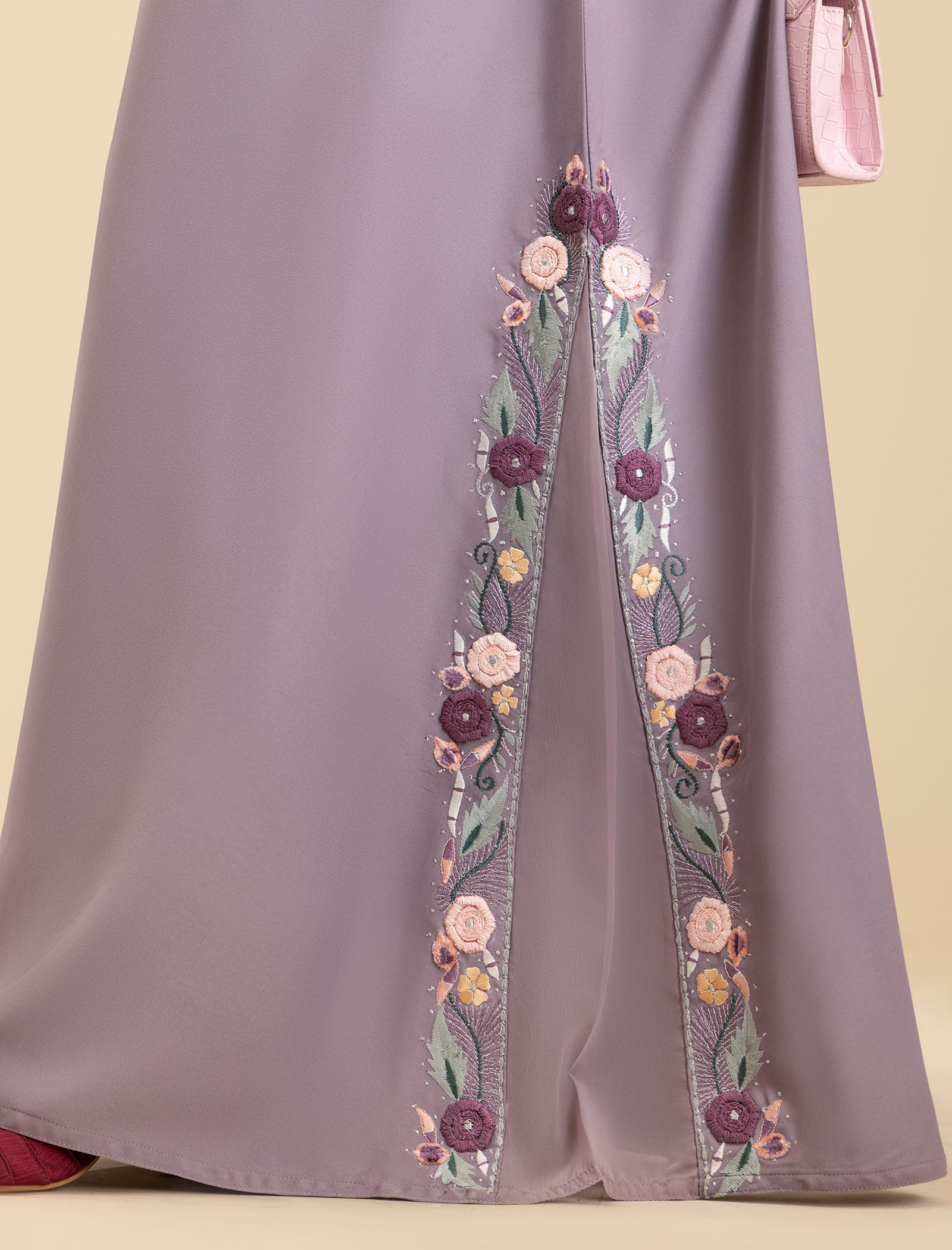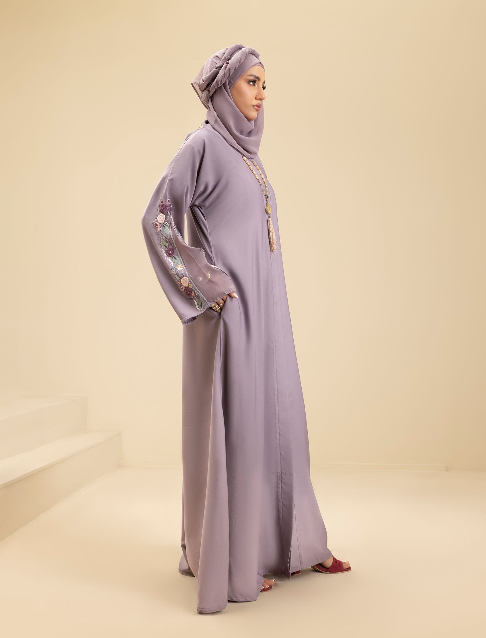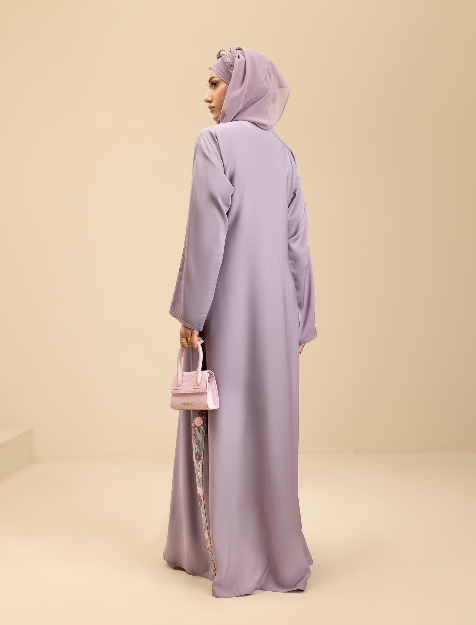 The Amethyst Glow abaya is a perfect blend of modern style and traditional elegance. The embroidery features a mix of threads and colors, designed to match the latest trends. The Kali design on the sleeves and daman (hem) adds intricate beauty and sophistication, enhancing the overall look of the abaya.