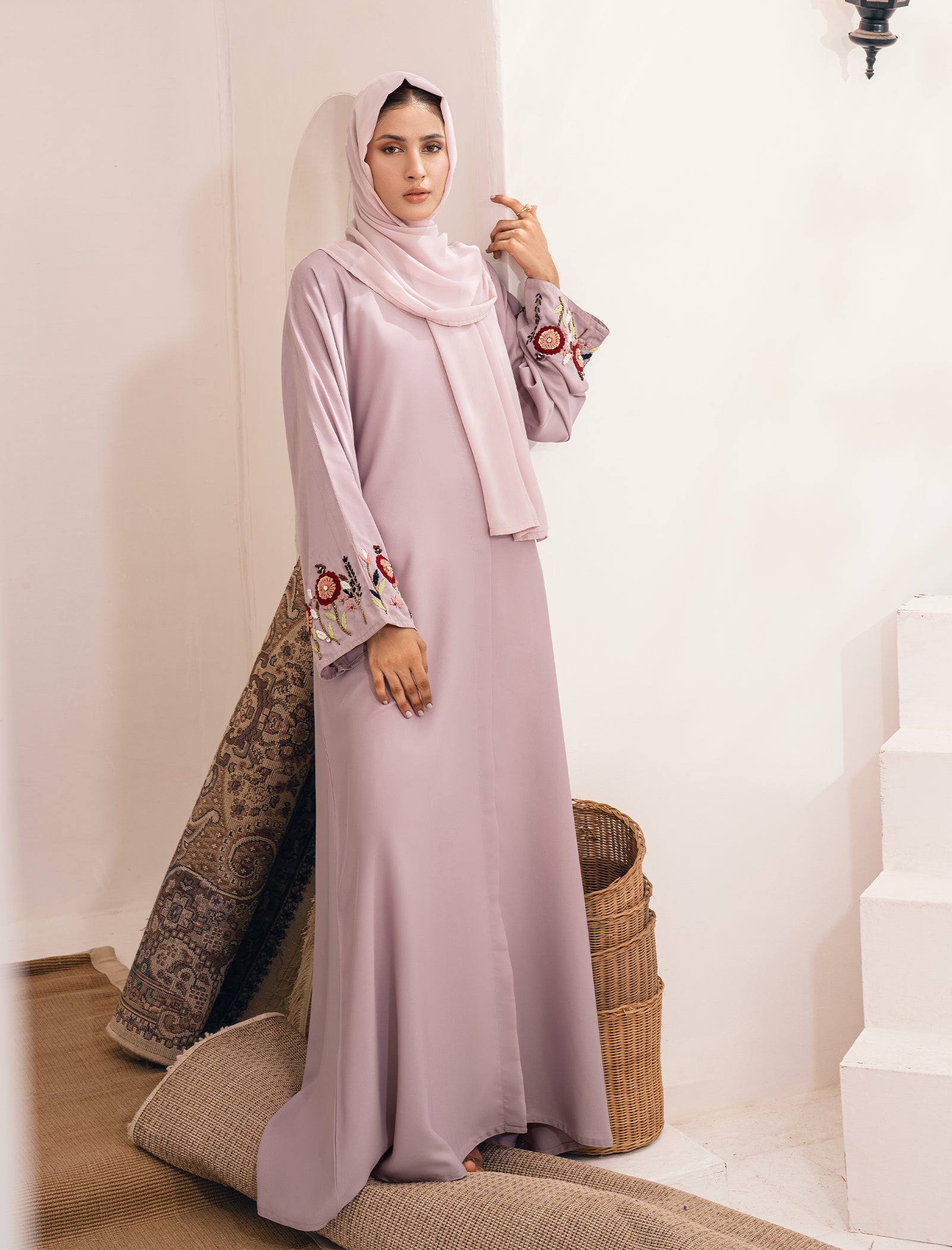 This pastel lilac abaya showcases delicate woolen thread handwork on the sleeves, using a vibrant array of colors for a fine look. The front open style is enhanced by a practical side pocket and a matching scarf, creating a versatile and elegant ensemble.