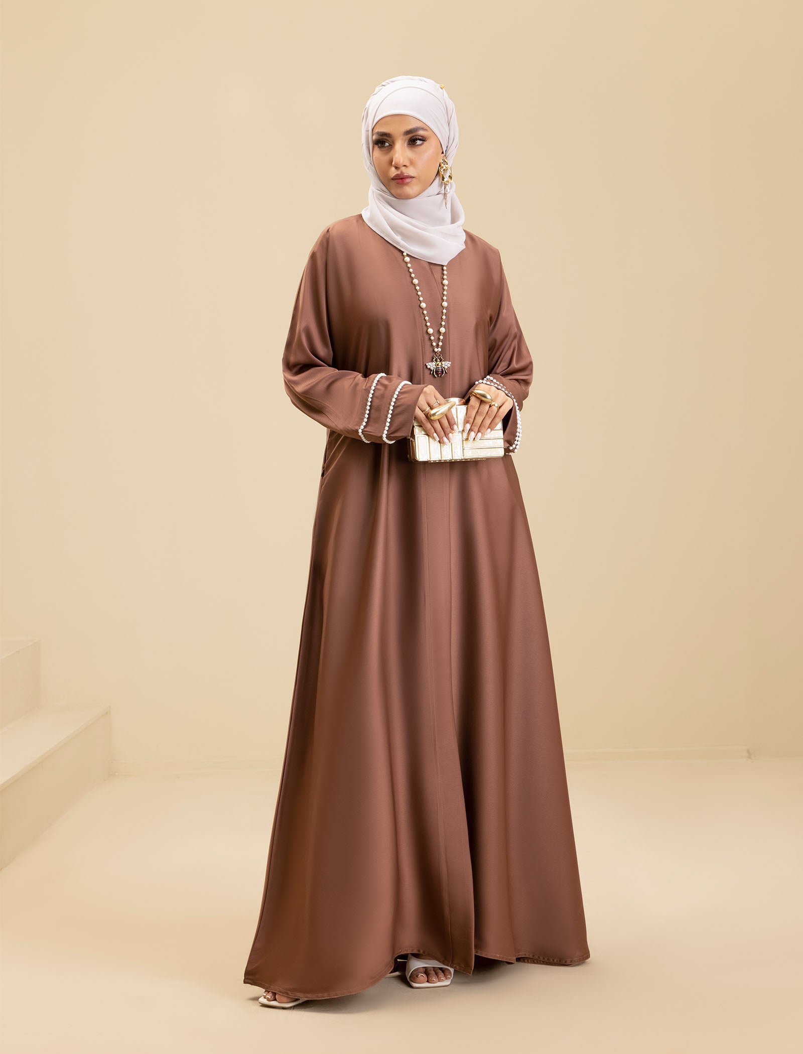 The Autumn Ember abaya is made from luxury textured Nidah fabric, a high-quality material that offers a perfect shine, giving the abaya an alluring and charming look. The fancy pearls embellishment on the sleeves adds a refined touch of elegance, completing the overall design.