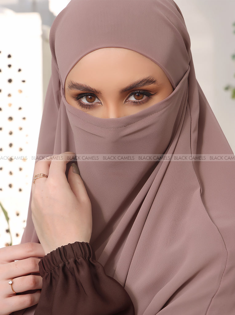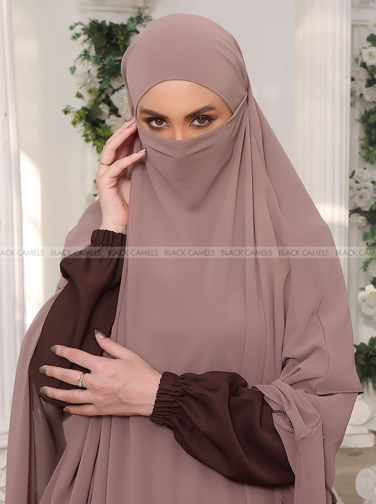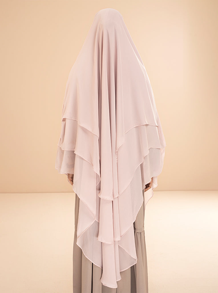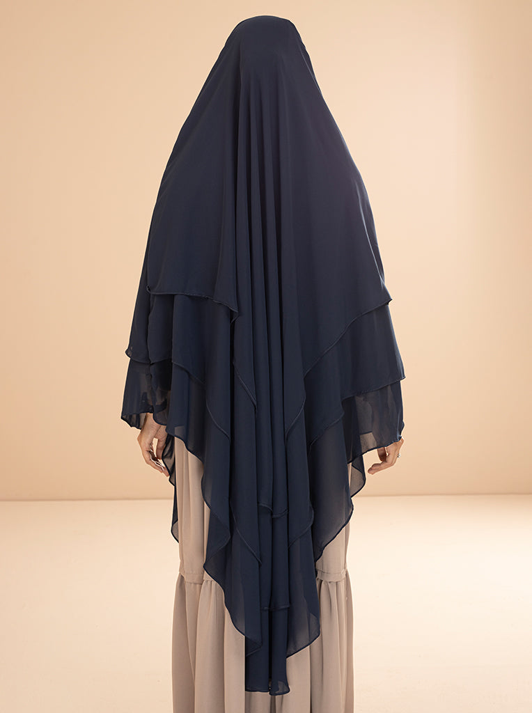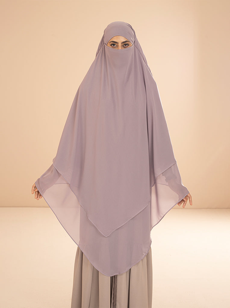 Bareerah Khimar is a hijab with long lengths. It has more coverage. Made with chiffon georgette material which makes it breathable and easy to wear. Multiple layers makes the hijab opaque and gives it a beautiful look. Niqab can be pulled down the chin when required, Niqab also has ties to be knot at the back when required.