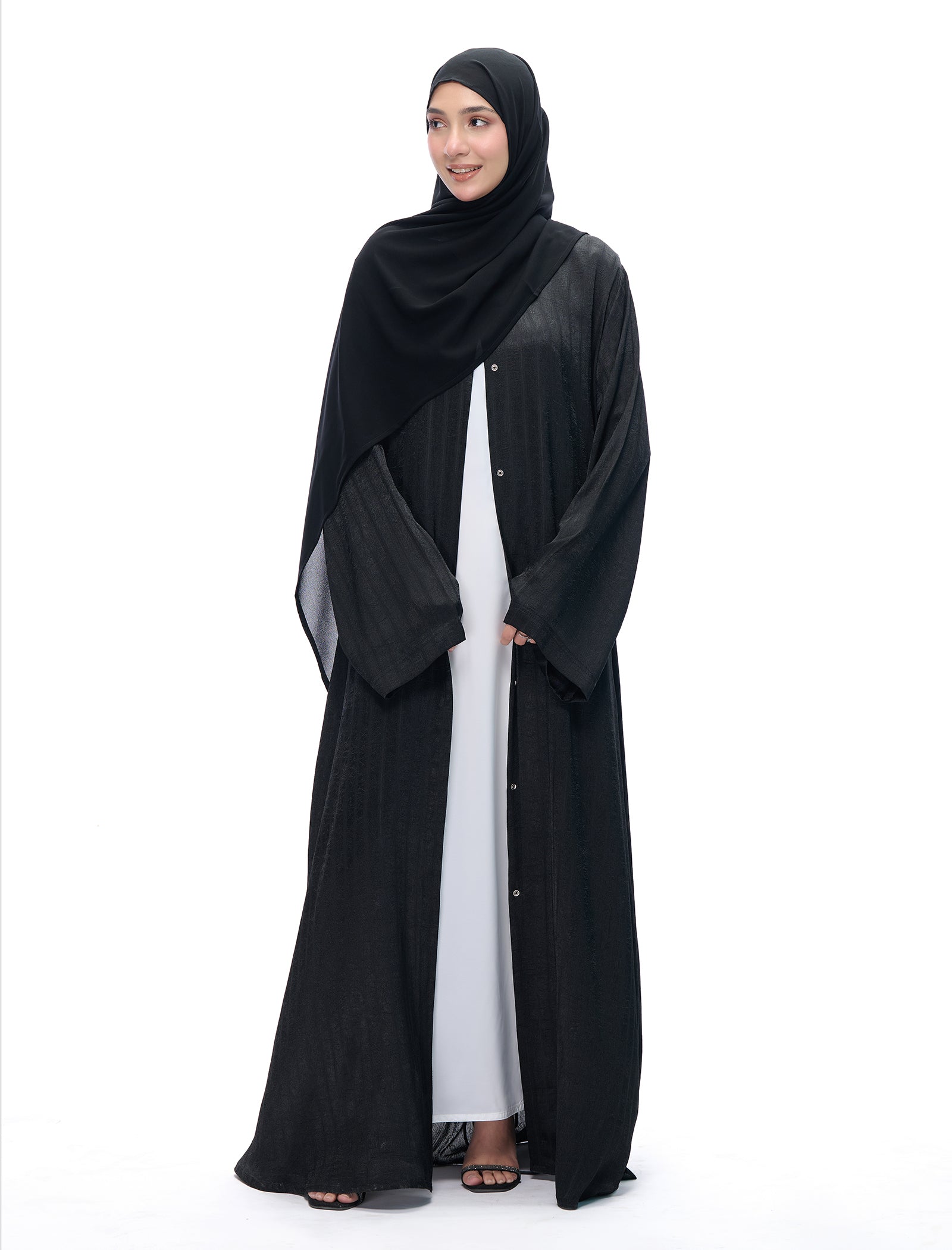 This black abaya features a relaxed fit with a subtle shiny finish for graceful movement.