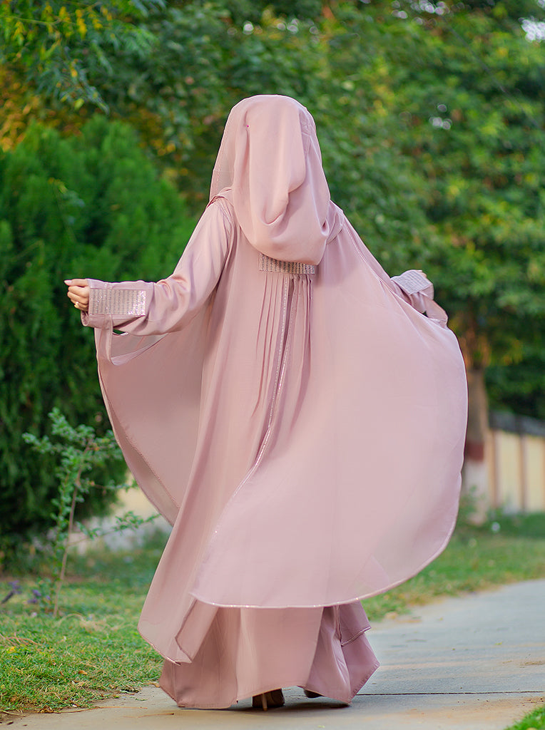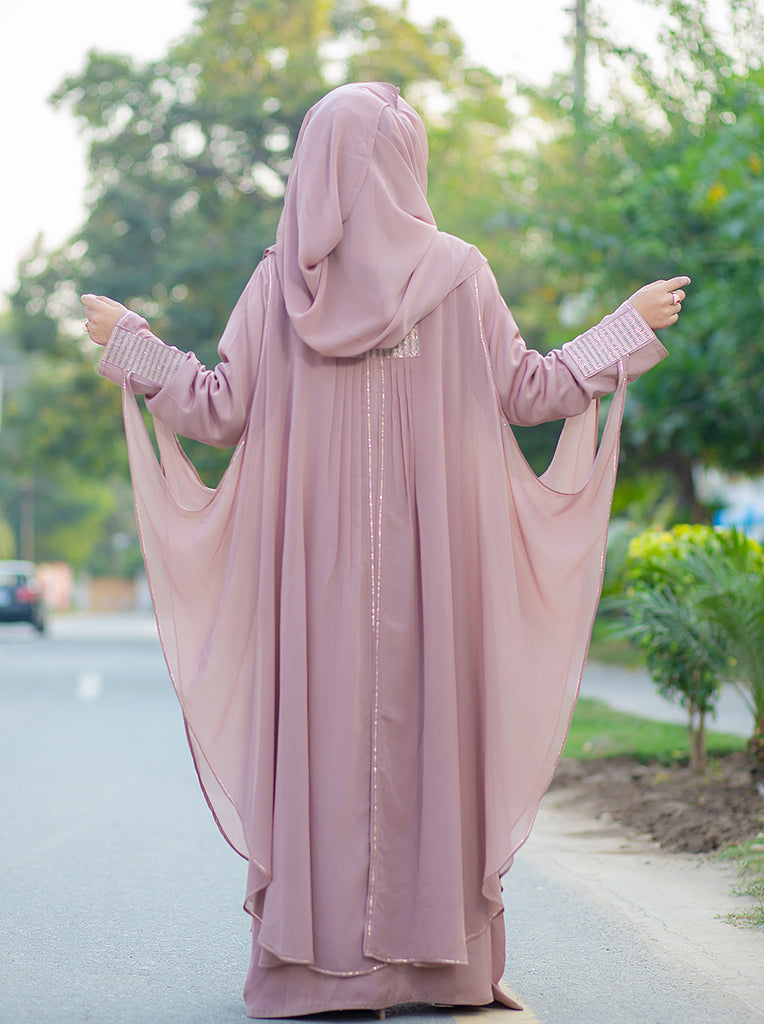 Dania Farasha abaya is made using the finest quality of Chiffon with exquisite original DMC Rhinestones work. The set includes abaya with same shade scarf.Niqab is not a part of this Abaya set but can be ordered separately.
