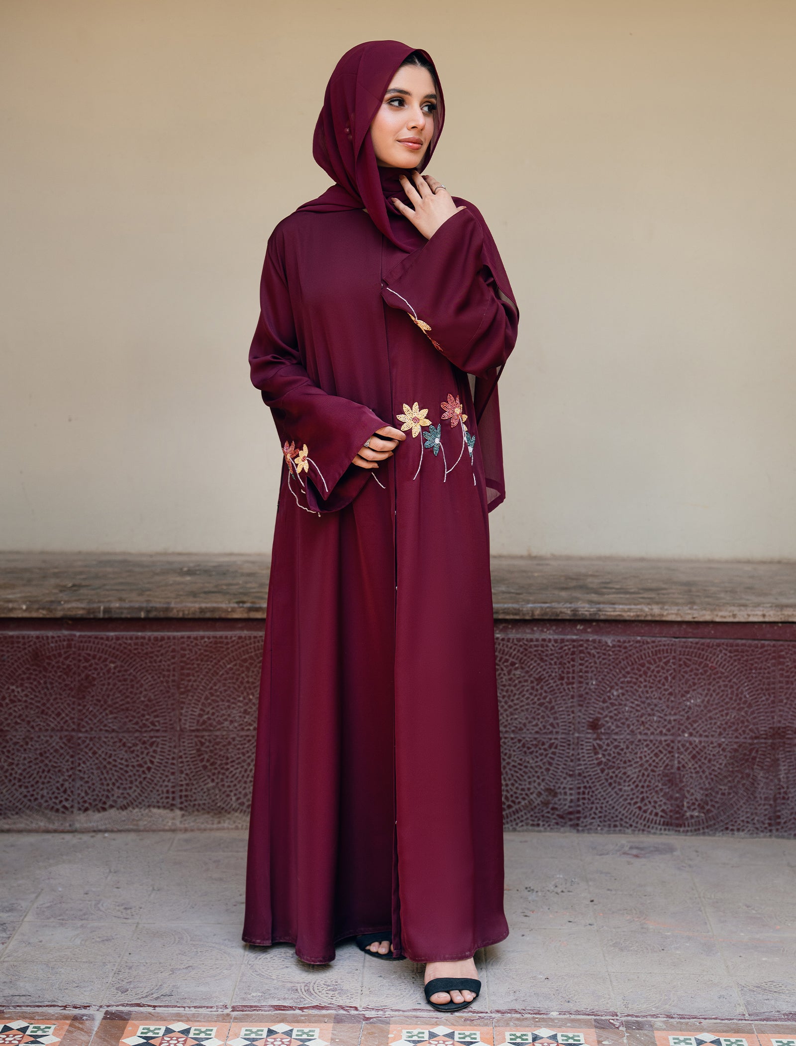 This maroon abaya features finely crafted floral handwork that adds a subtle pop of color to its timeless, fluid silhouette.