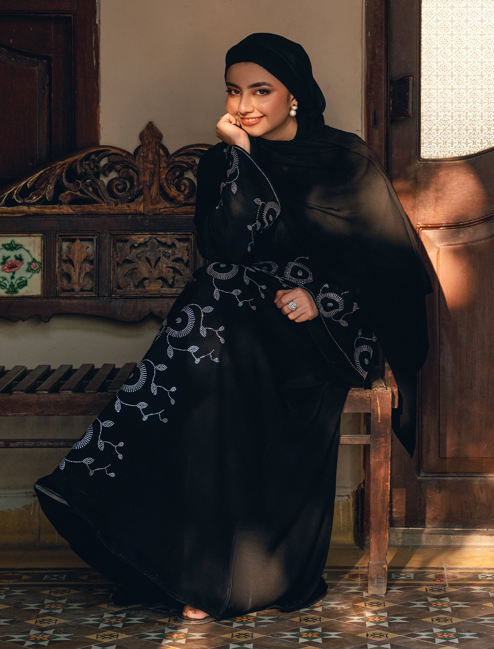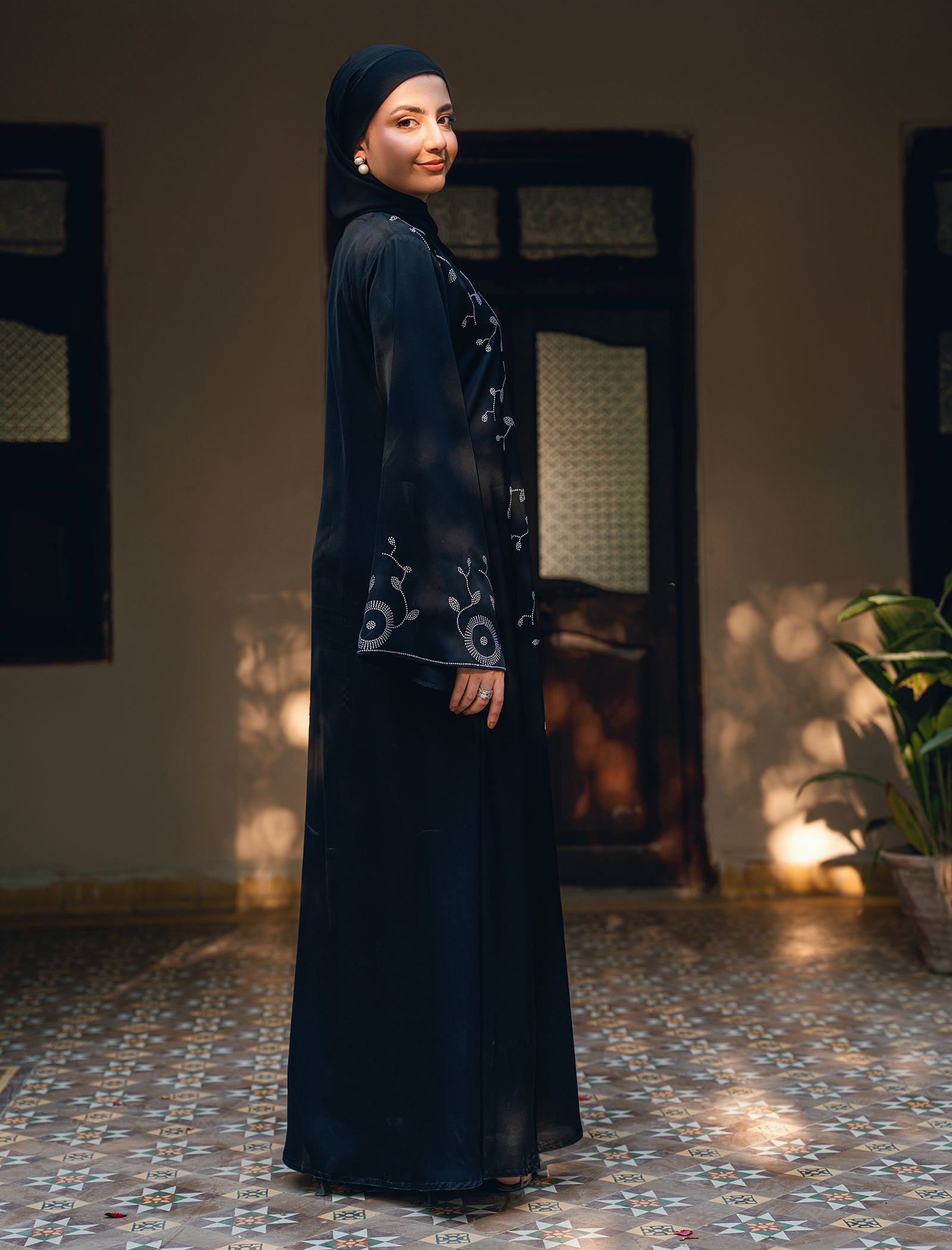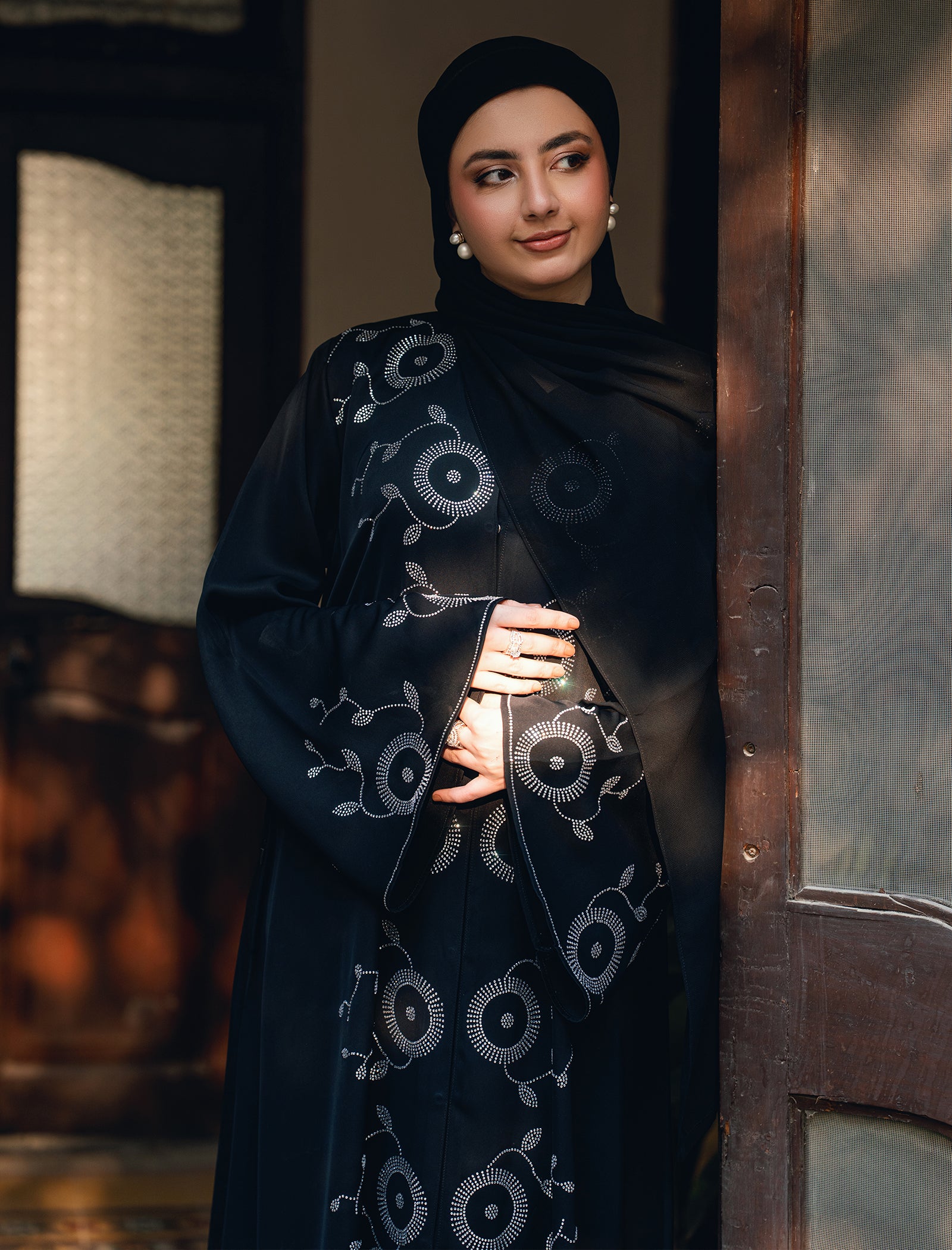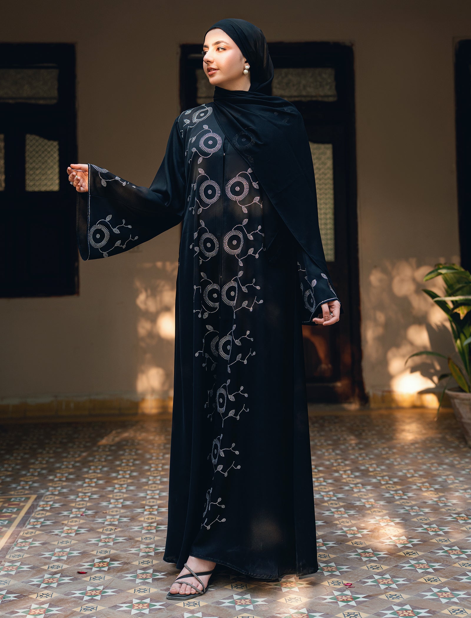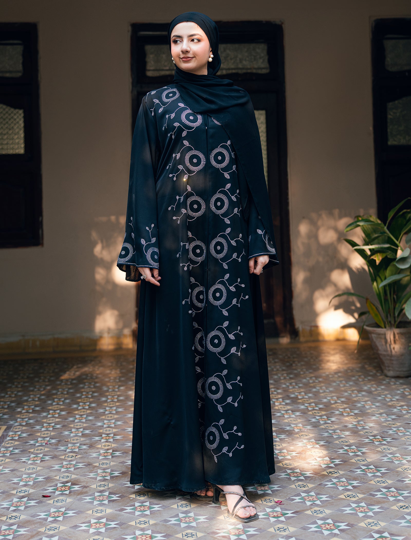 A timeless black abaya richly adorned with all-over original DMC rhinestones. Graceful, flowy, and designed to make a refined statement.