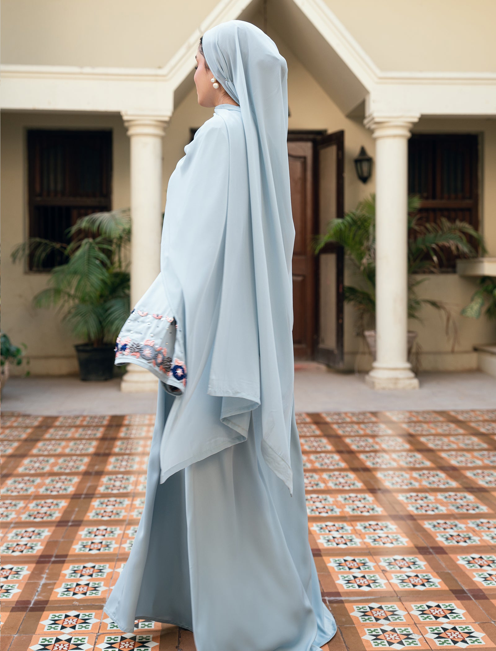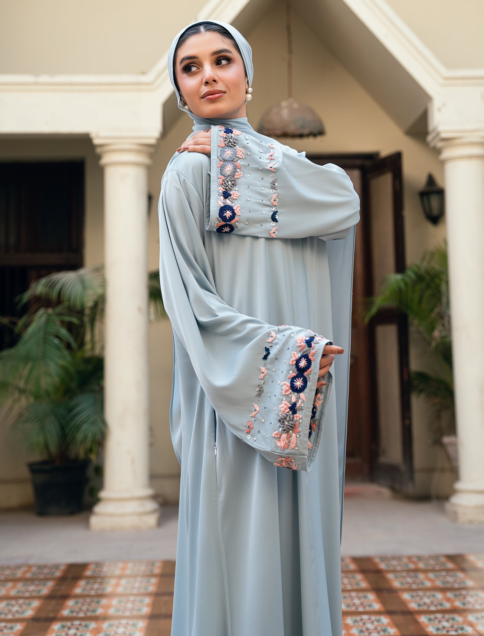 This ice-blue abaya is elevated with detailed handwork and subtle embellishments, adding a refined statement to an elegant silhouette.