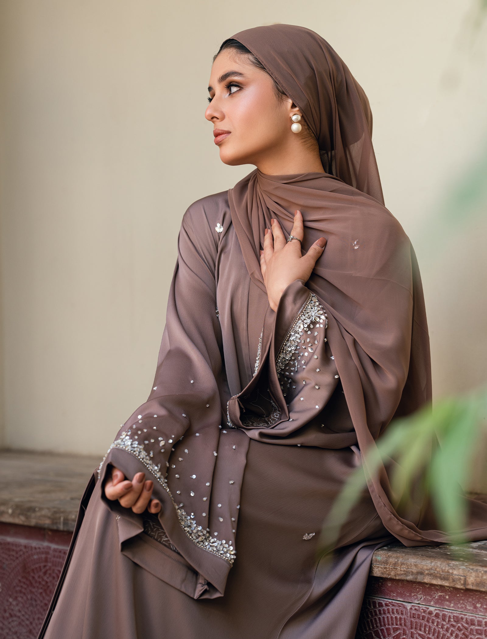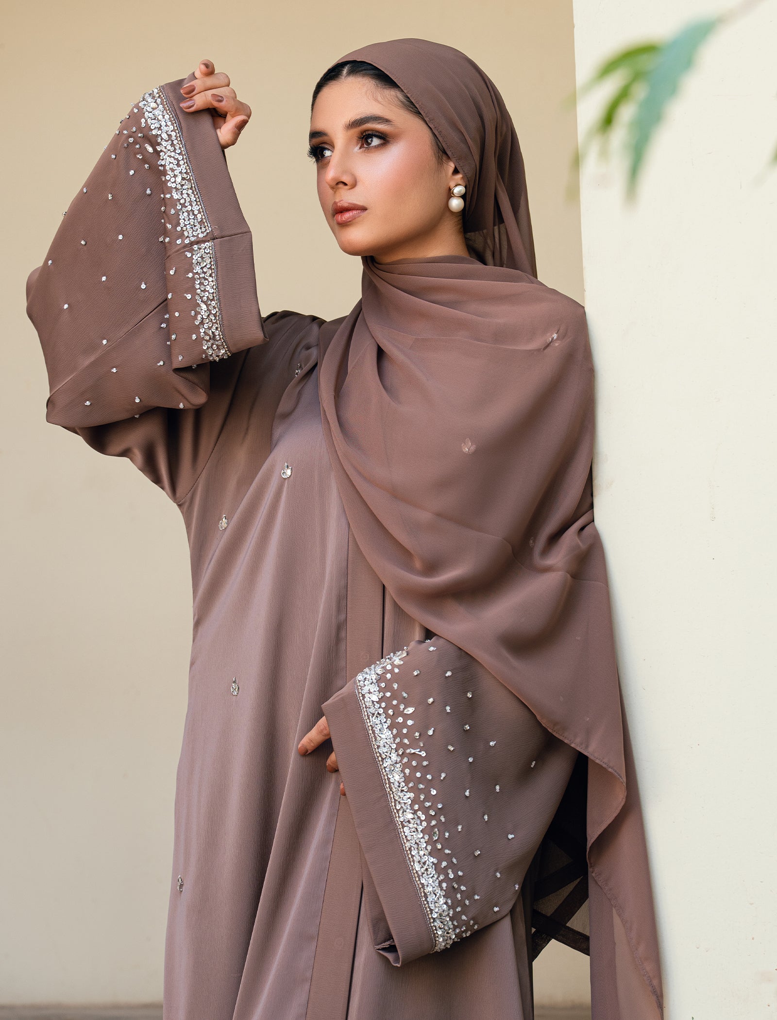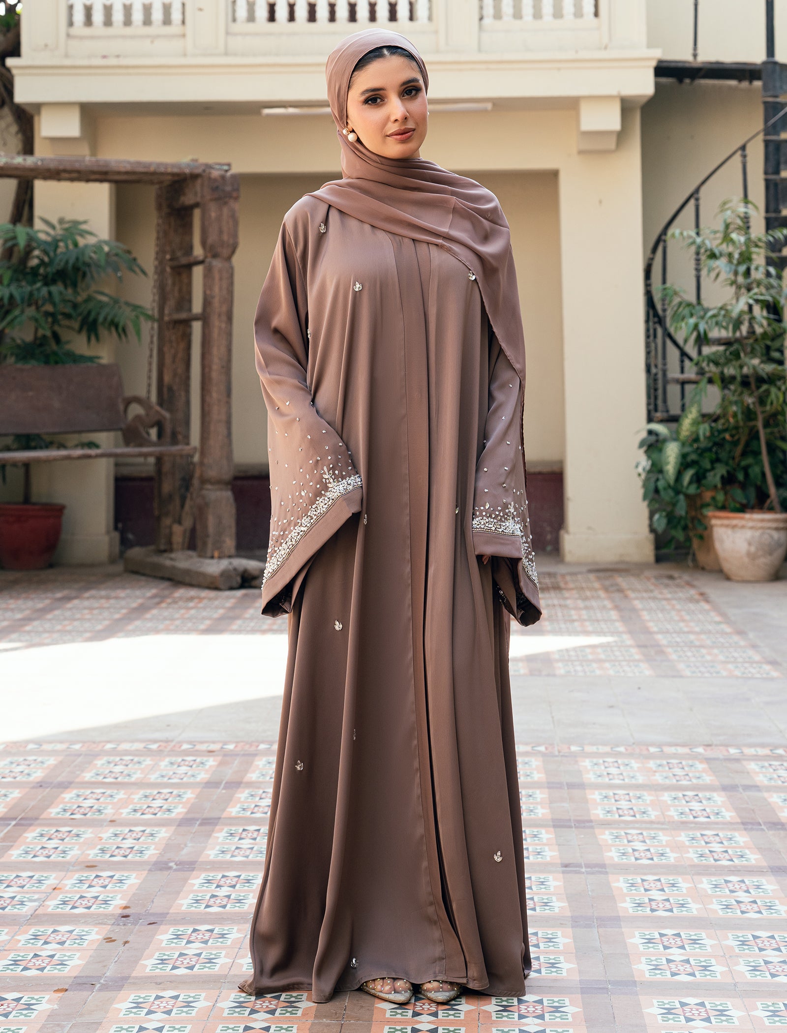 A rich brown abaya accented with delicate embellishments placed thoughtfully across the design. Flowy, graceful, and perfect for elevated occasions and graceful gatherings.