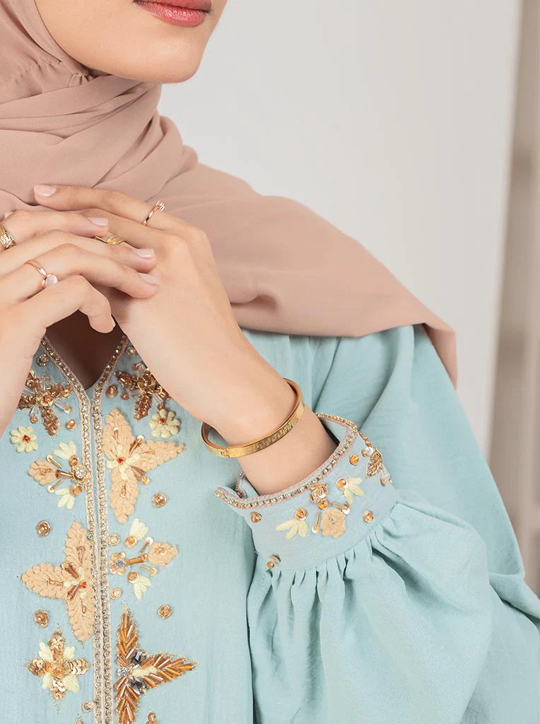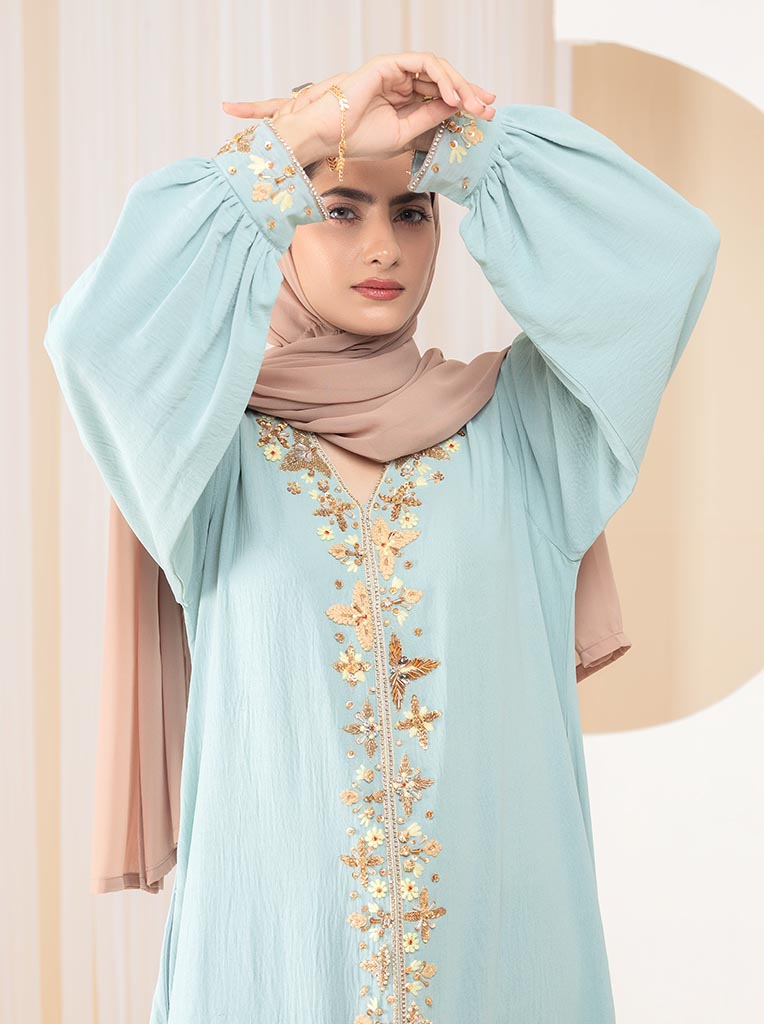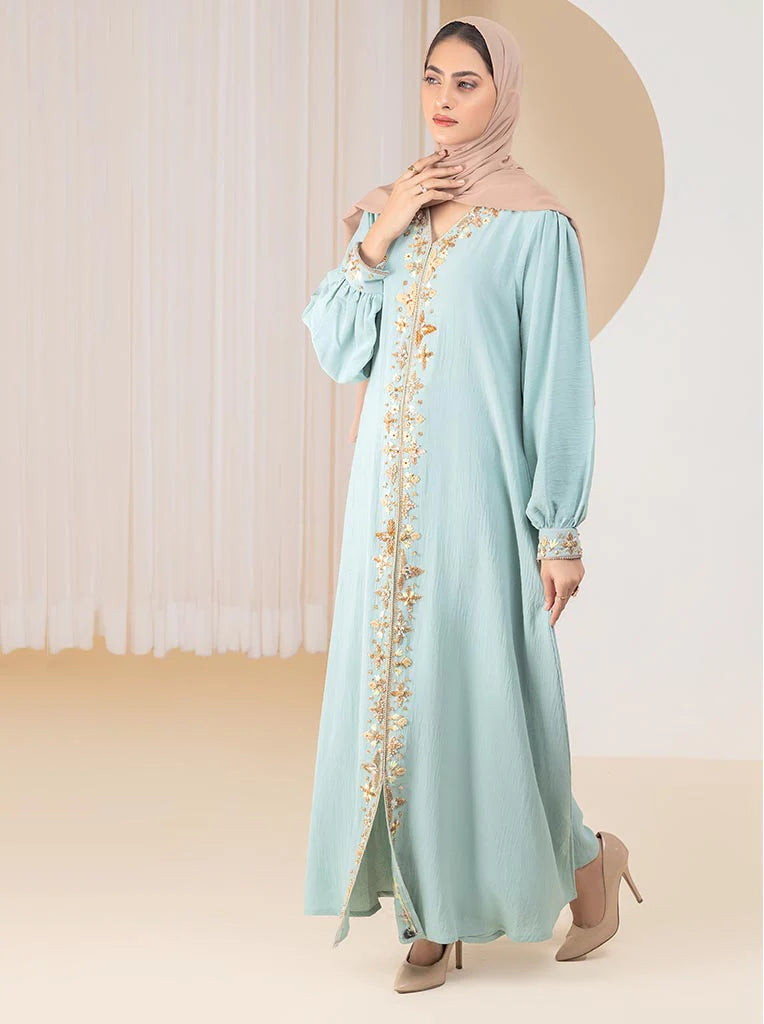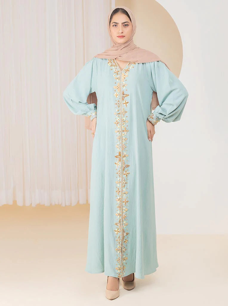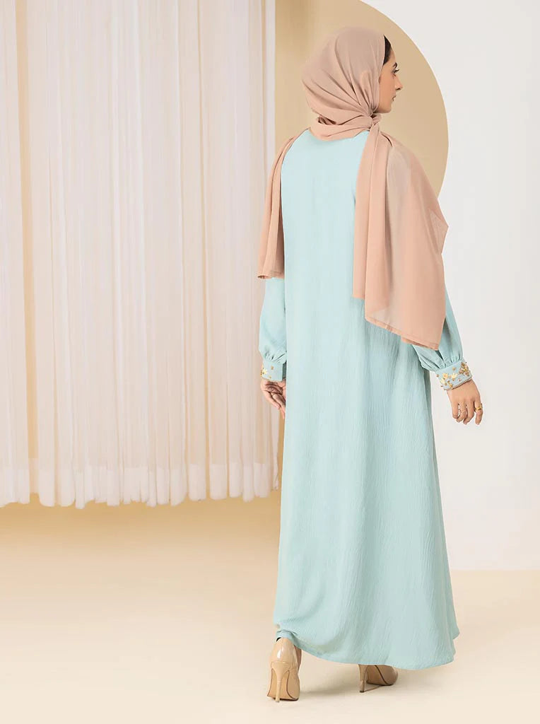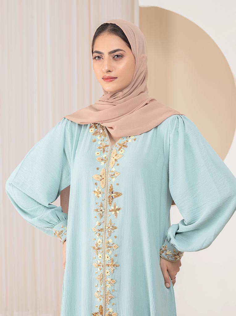 Ghazal Abaya – our front closed party wear abaya, perfect for weddings and special occasions. The abaya showcases exquisite and exclusive handwork, adding a touch of glamour to your ensemble. Its sleek design, with fancy cuffs, enhances its elegant appeal. Crafted from luxurious CEY Crush fabric.