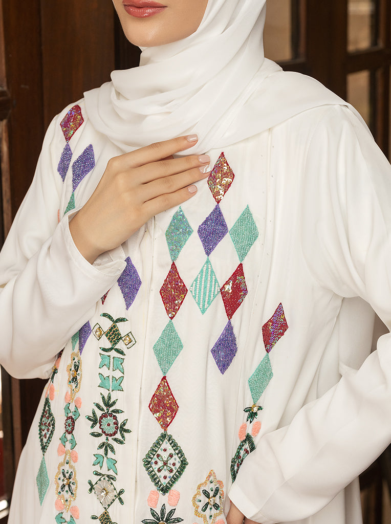 The Habiba Abaya, an exclusive handwork masterpiece with traditional embellishments and pleats. Crafted from luxurious Saudi Nidah fabric, this Front Open abaya includes a matching scarf for a complete look. Please note that a slit beneath the abaya is recommended (not included in the product).