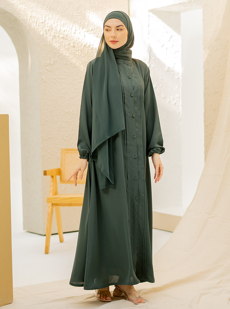 Elevate your style with our pleated front open abaya featuring tastefully matched colored fabric buttons,