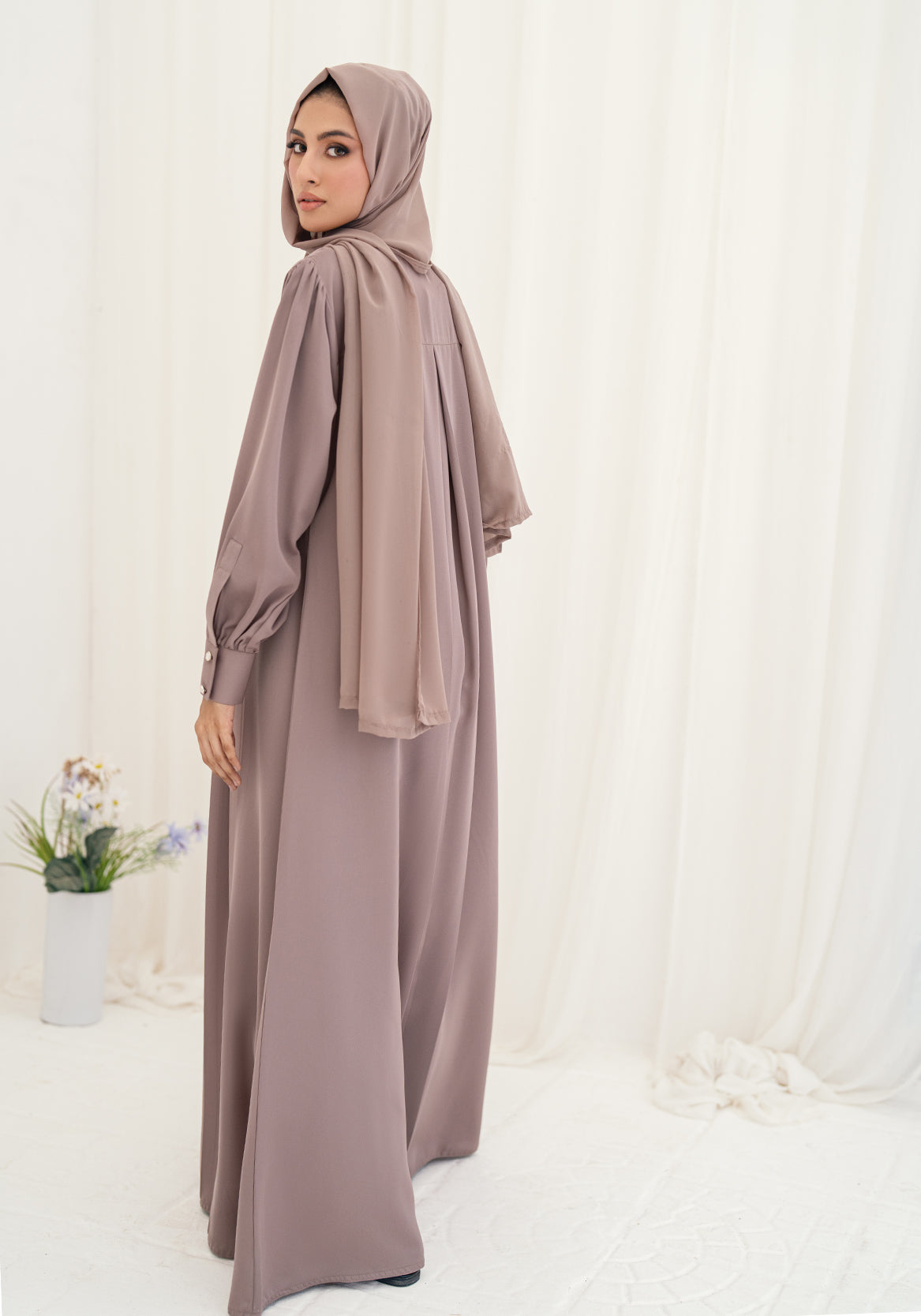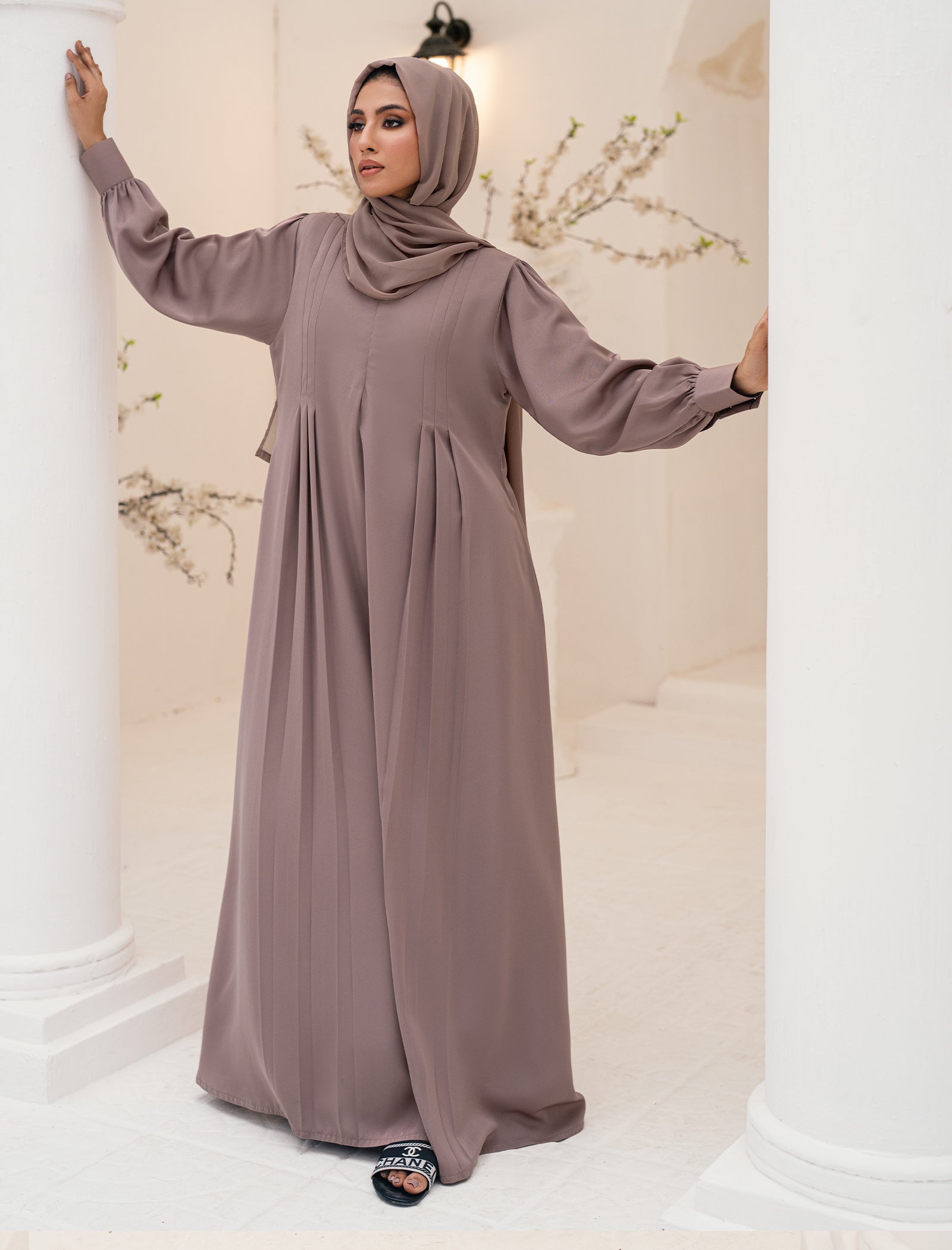 The perfect blend of classic and modern, this Black Camels maxi abaya features a sleek front zipper and is crafted from premium Saudi Nidah fabric. The balloon sleeves with cuffs and matching scarf make it a sophisticated choice for any occasion.