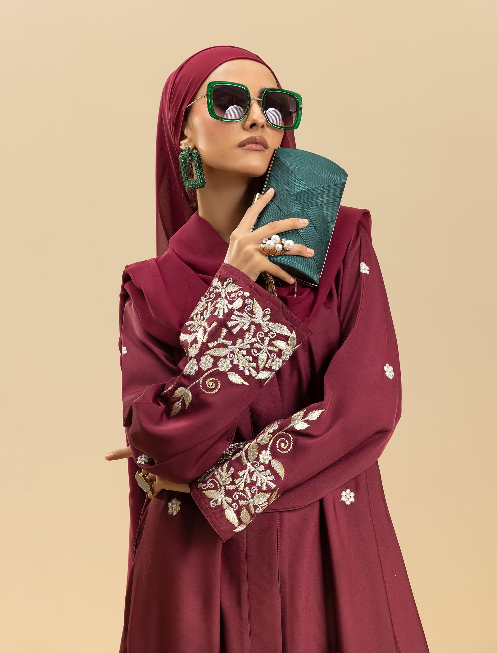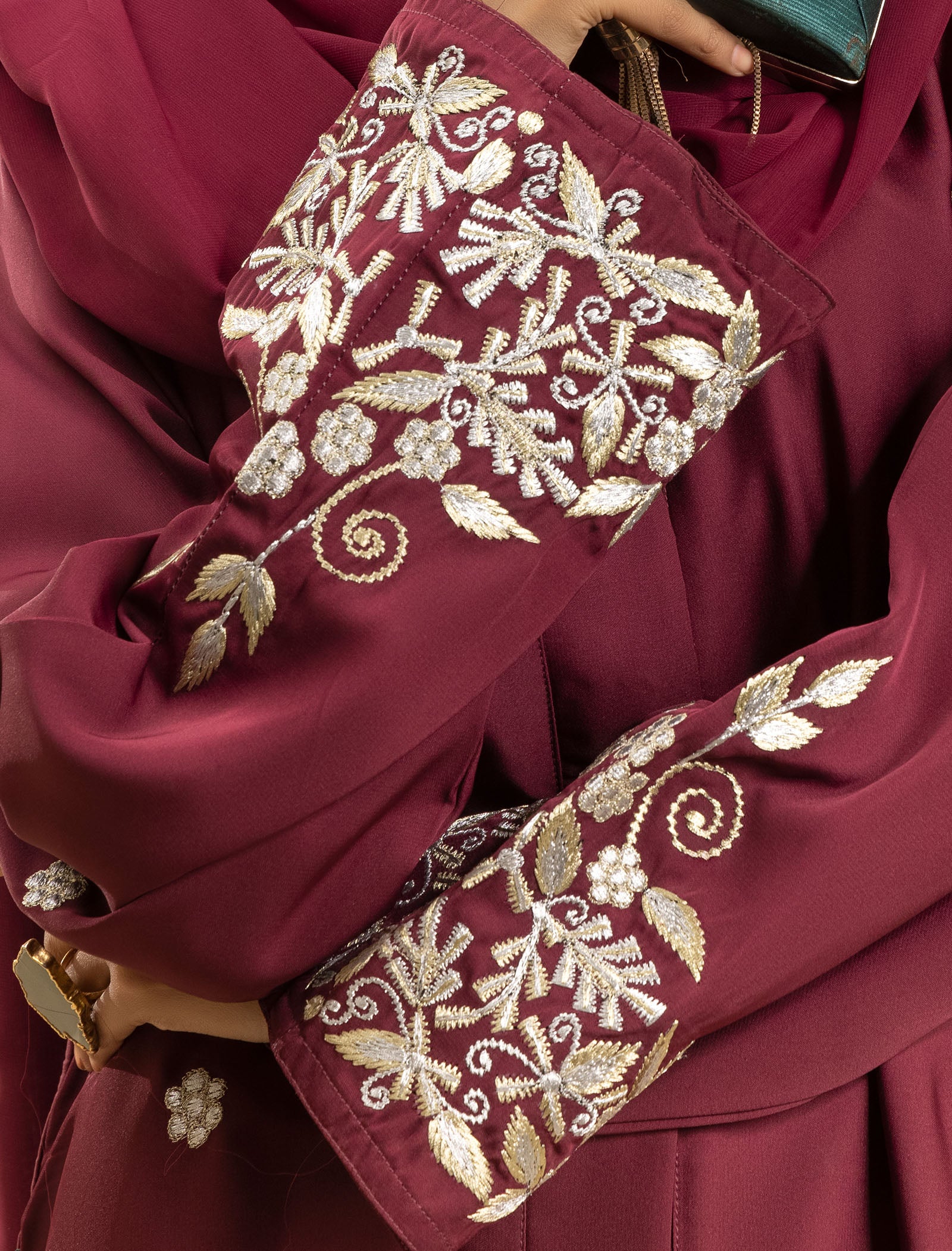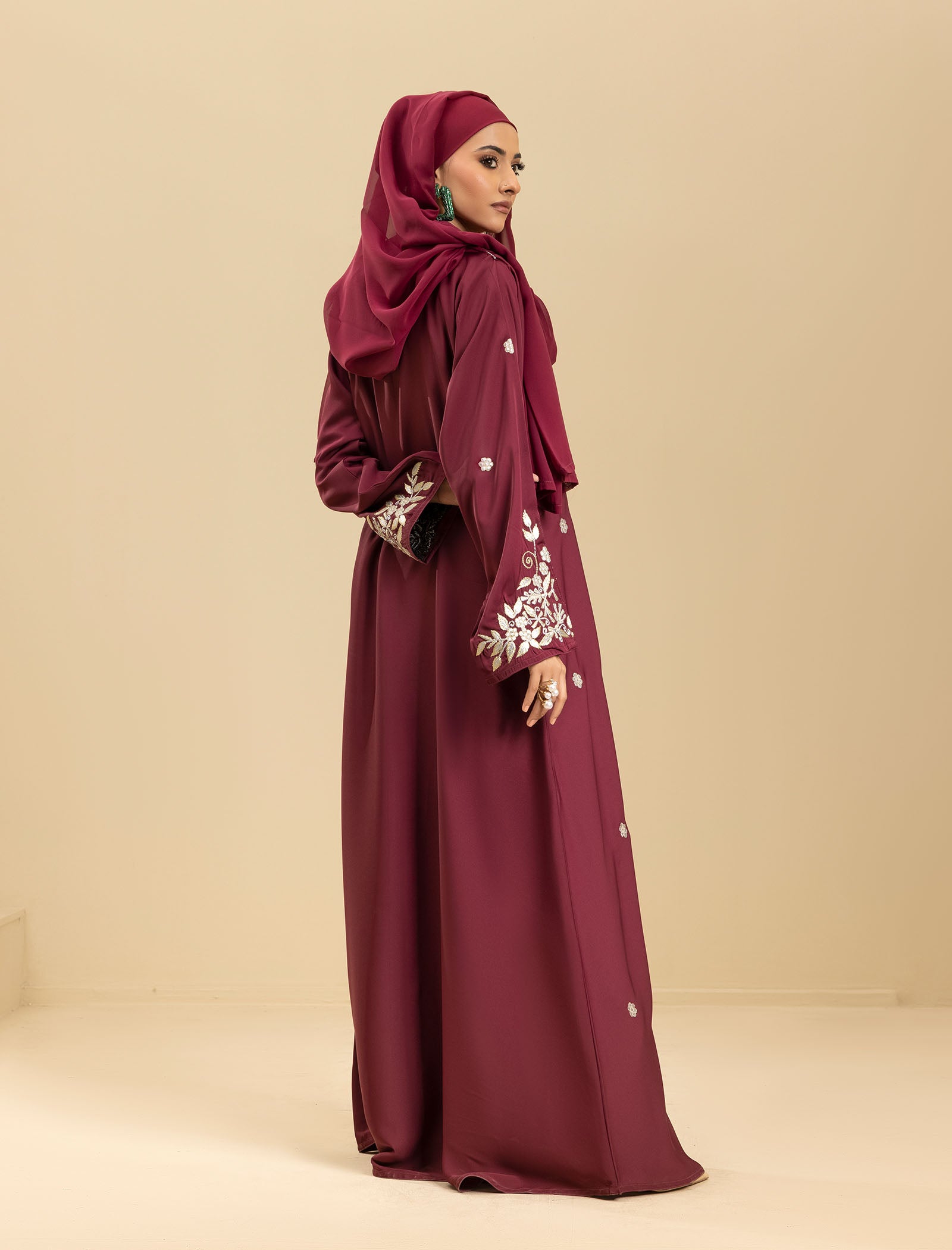 This beautiful Burgundy abaya is the perfect choice for your festive occasions. Embellished with intricate embroidery made from luxurious threads on both the sleeves and front, it exudes elegance and charm, making it an ideal festive attire.