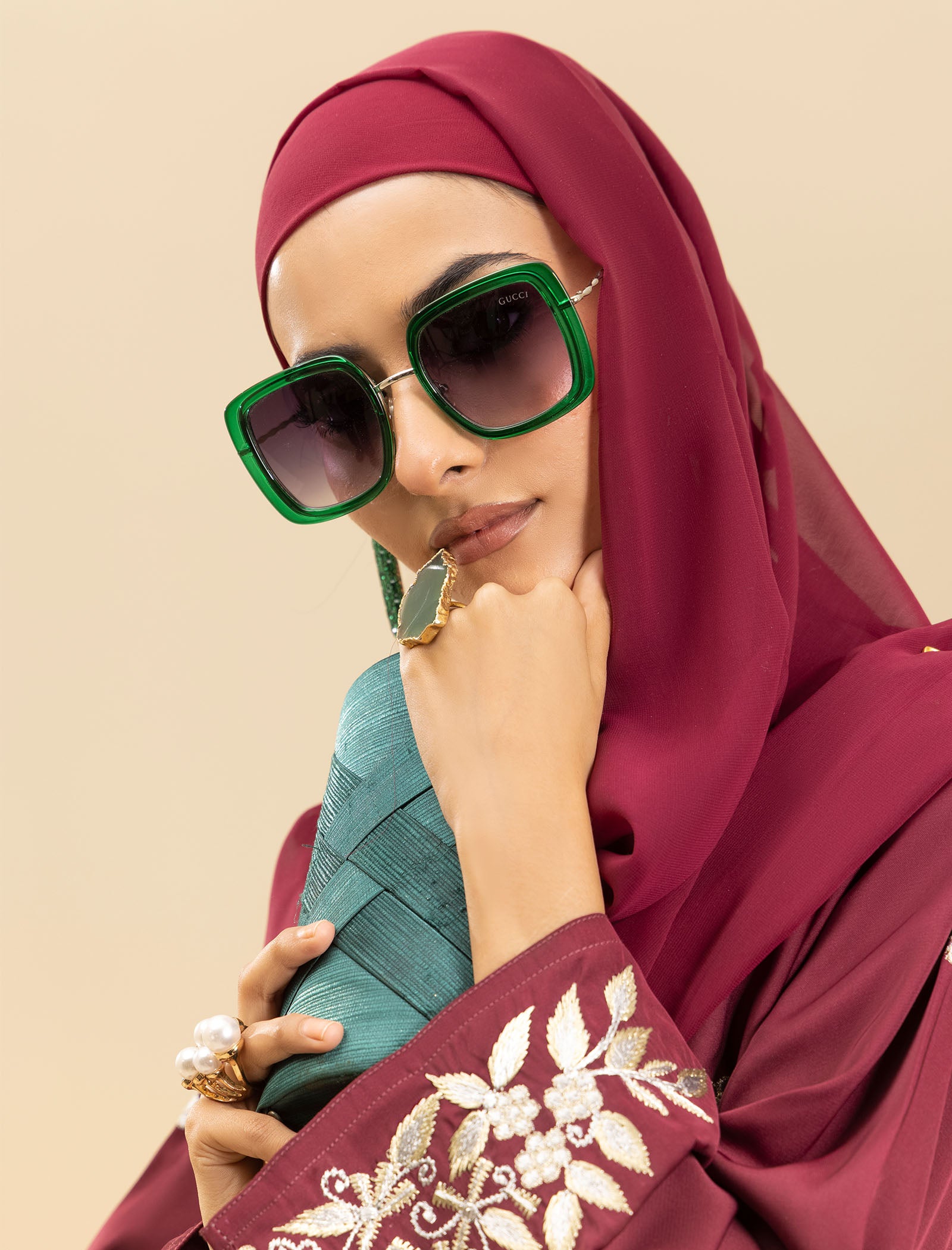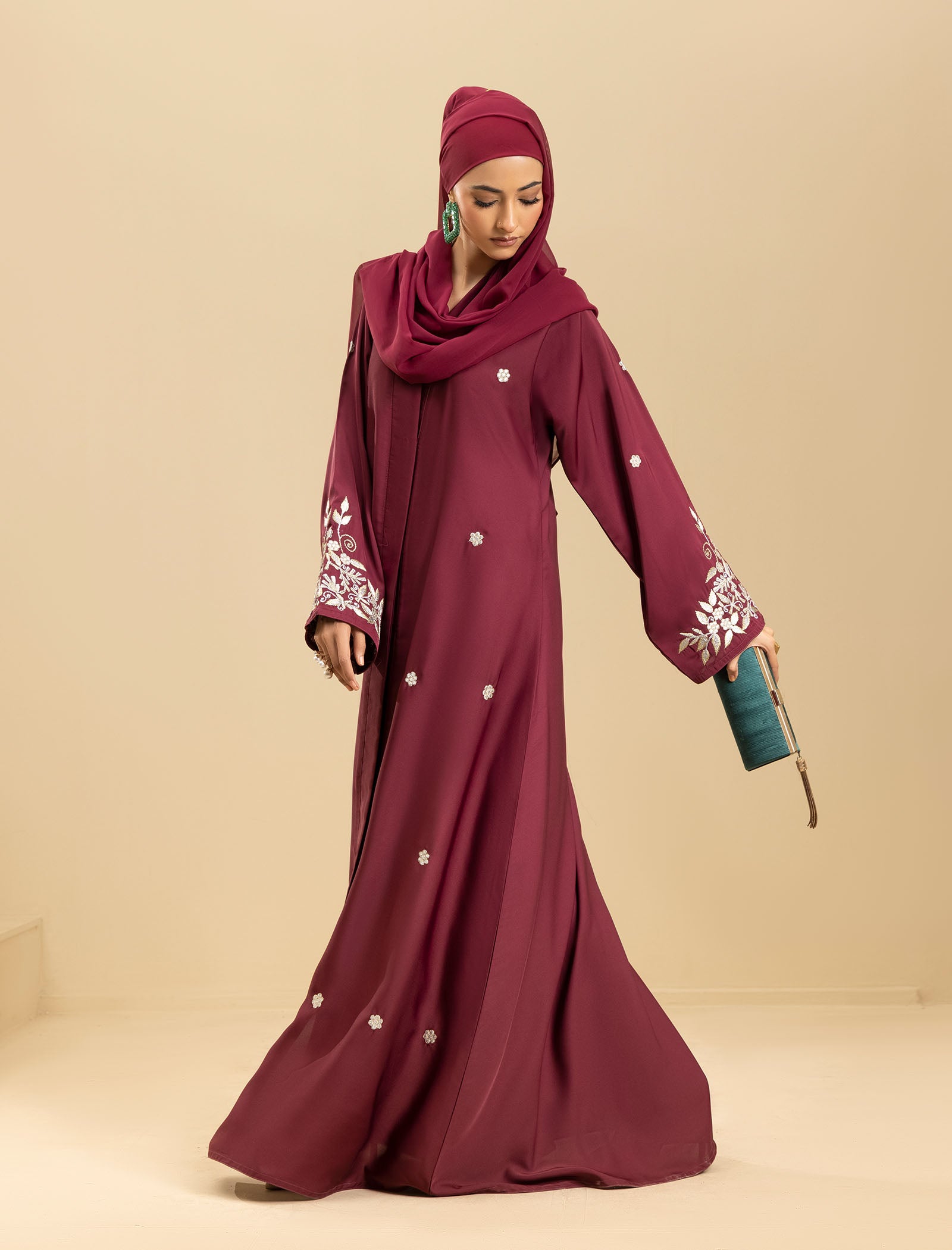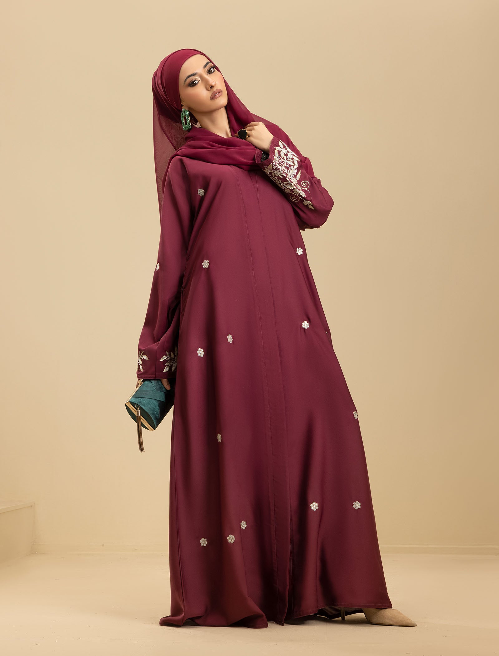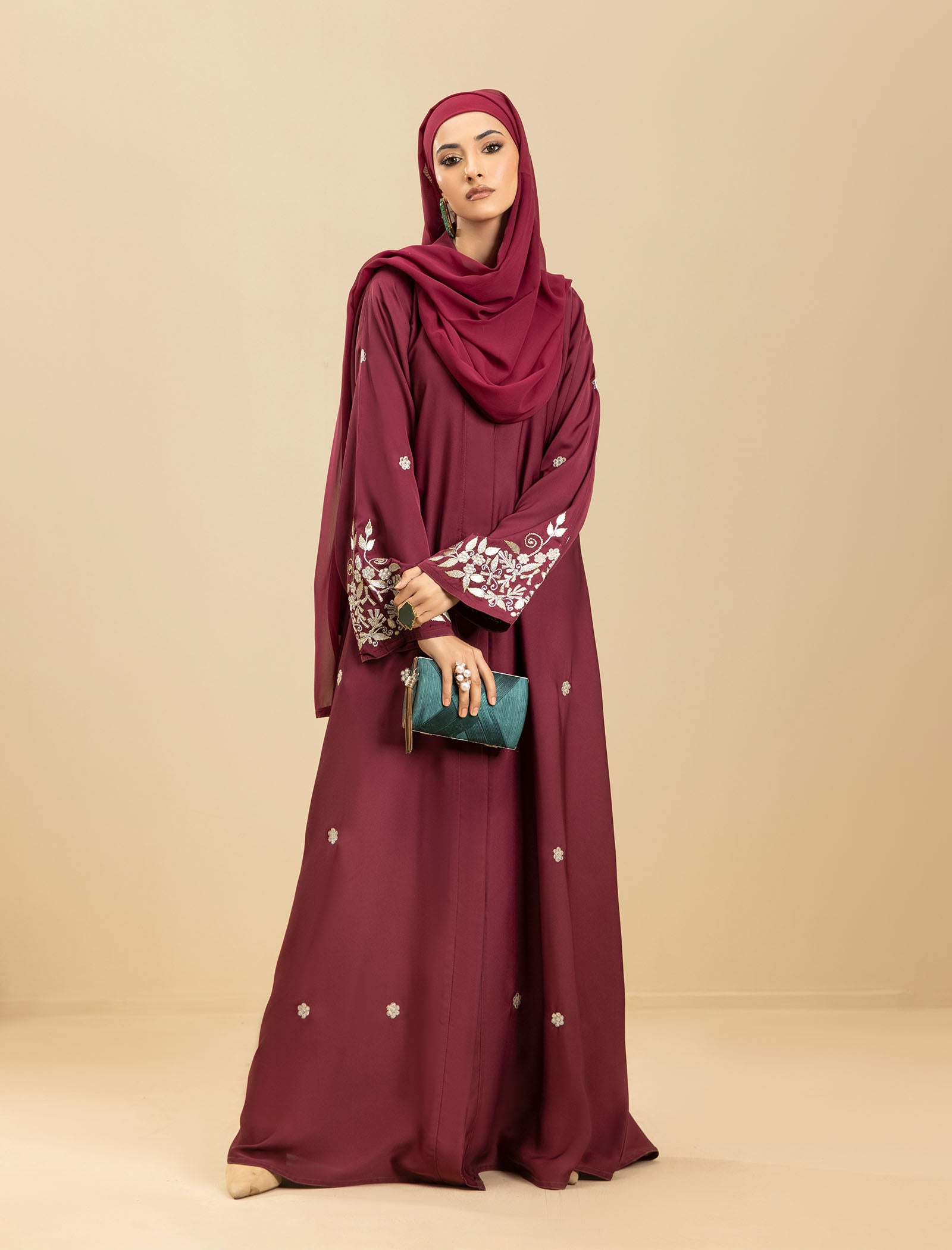 This beautiful Burgundy abaya is the perfect choice for your festive occasions. Embellished with intricate embroidery made from luxurious threads on both the sleeves and front, it exudes elegance and charm, making it an ideal festive attire.