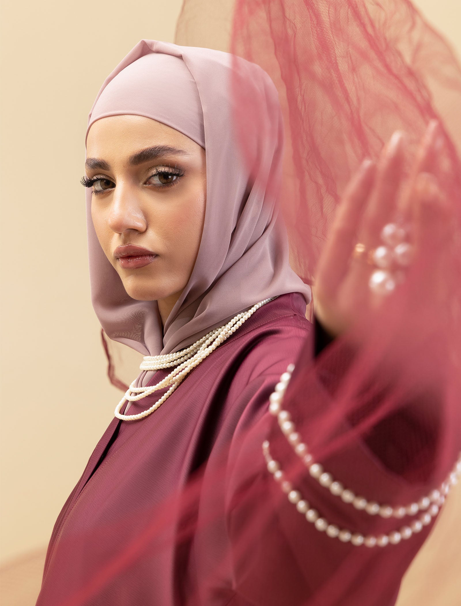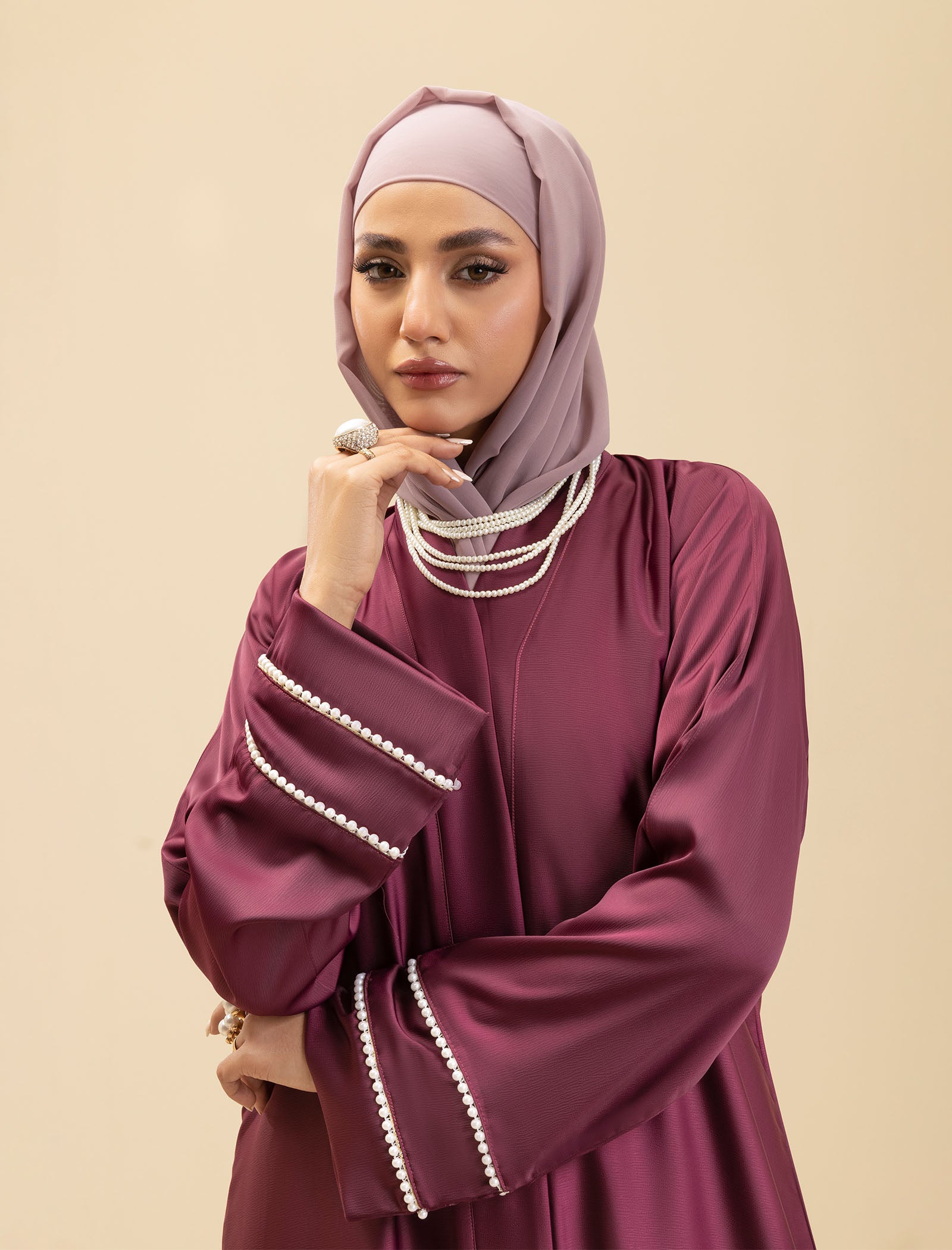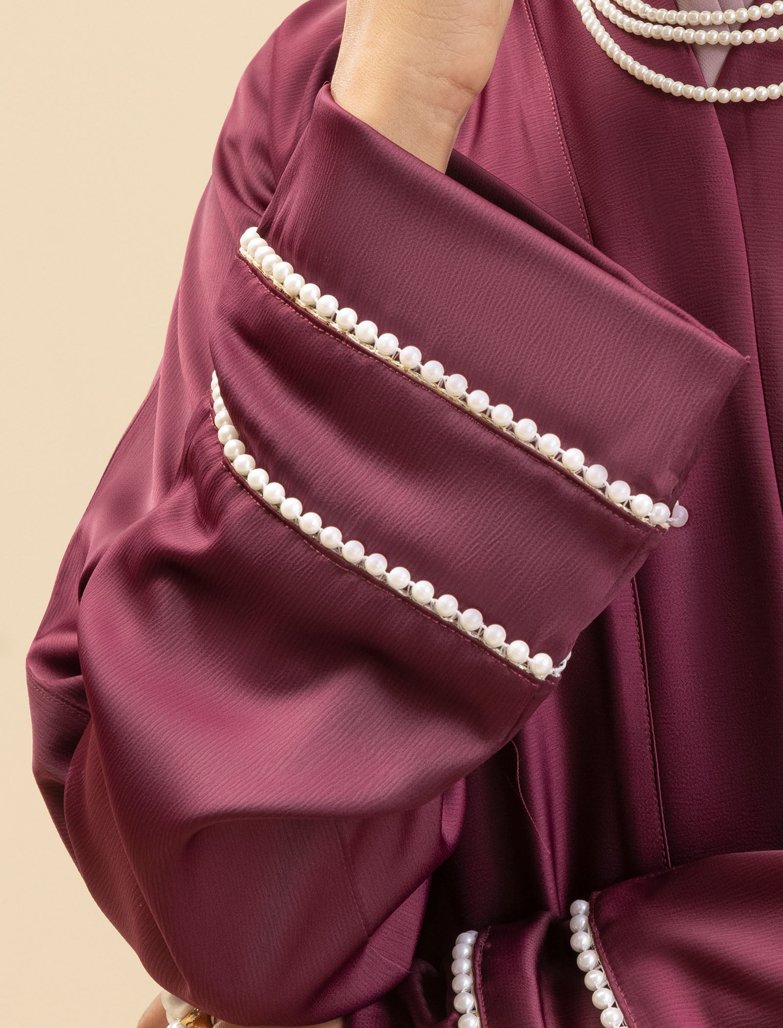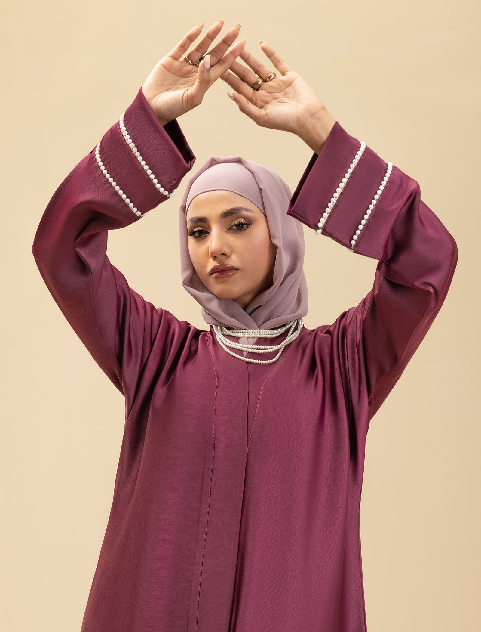 The Majestic Berry abaya is crafted from luxury textured Premium Nidah fabric, offering a high-quality material with a perfect shine that gives the product an elegant and charming look. The fancy pearls embellishment on the sleeves adds a touch of sophistication, completing the refined design.
