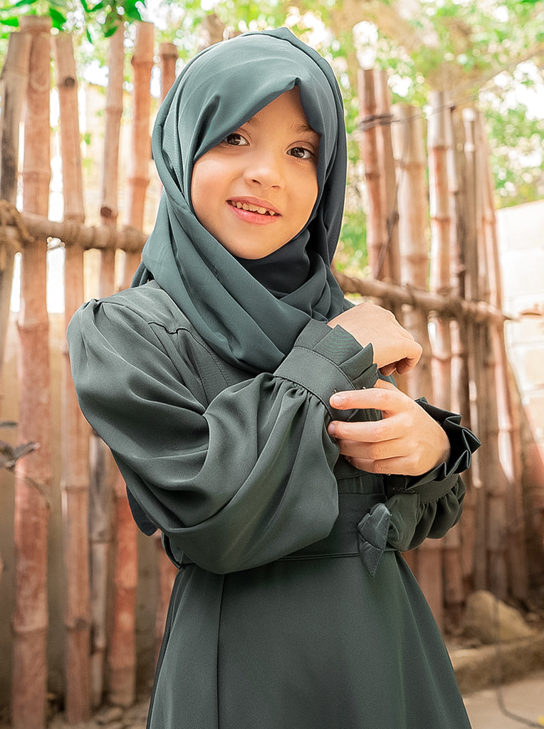 Introducing the Manal Maxi Abaya, a graceful fusion of style and comfort. Designed with a wide flair and chic panel cuts on the front, this abaya comes complete with a trendy belt and charming fancy sleeves. Your kids will look absolutely stunning in this beautiful ensemble, perfect for any occasion. Elevate their wardrobe with elegance and flair.