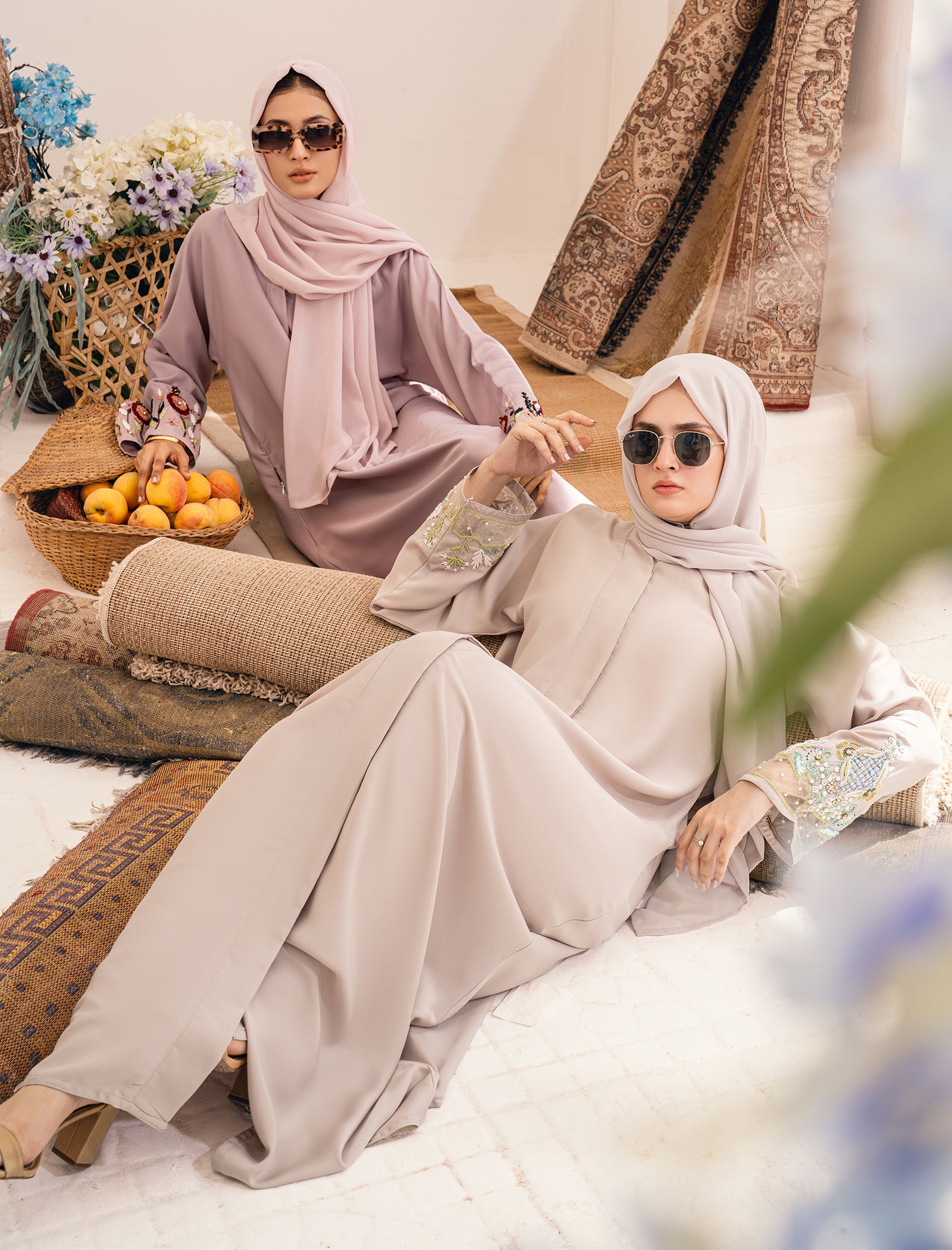 Illuminate your style with our pastel cream abaya, featuring detailed fancy handwork. The net and embellishments are crafted to perfection, complemented by a coordinating scarf and a side pocket for a radiant and practical look.