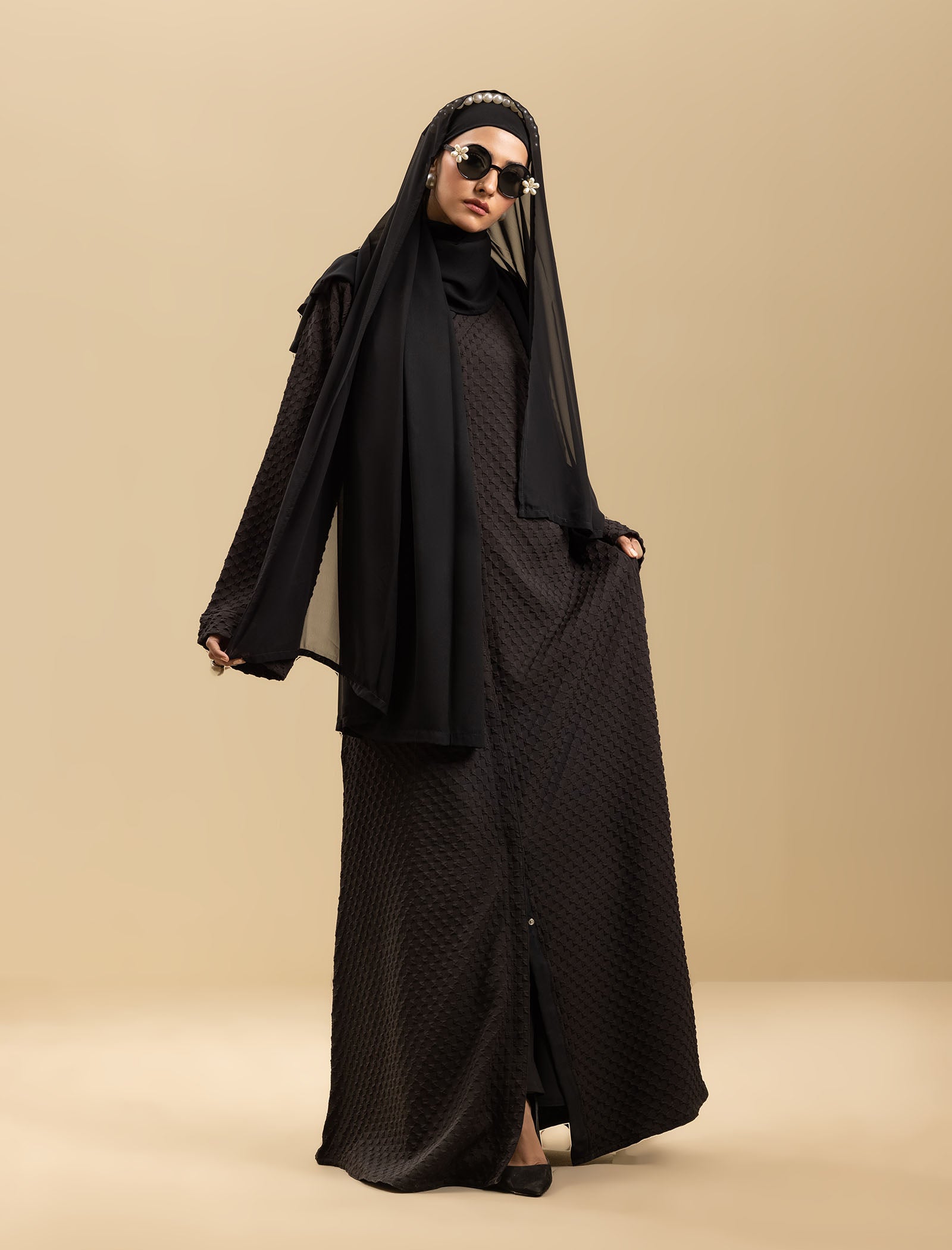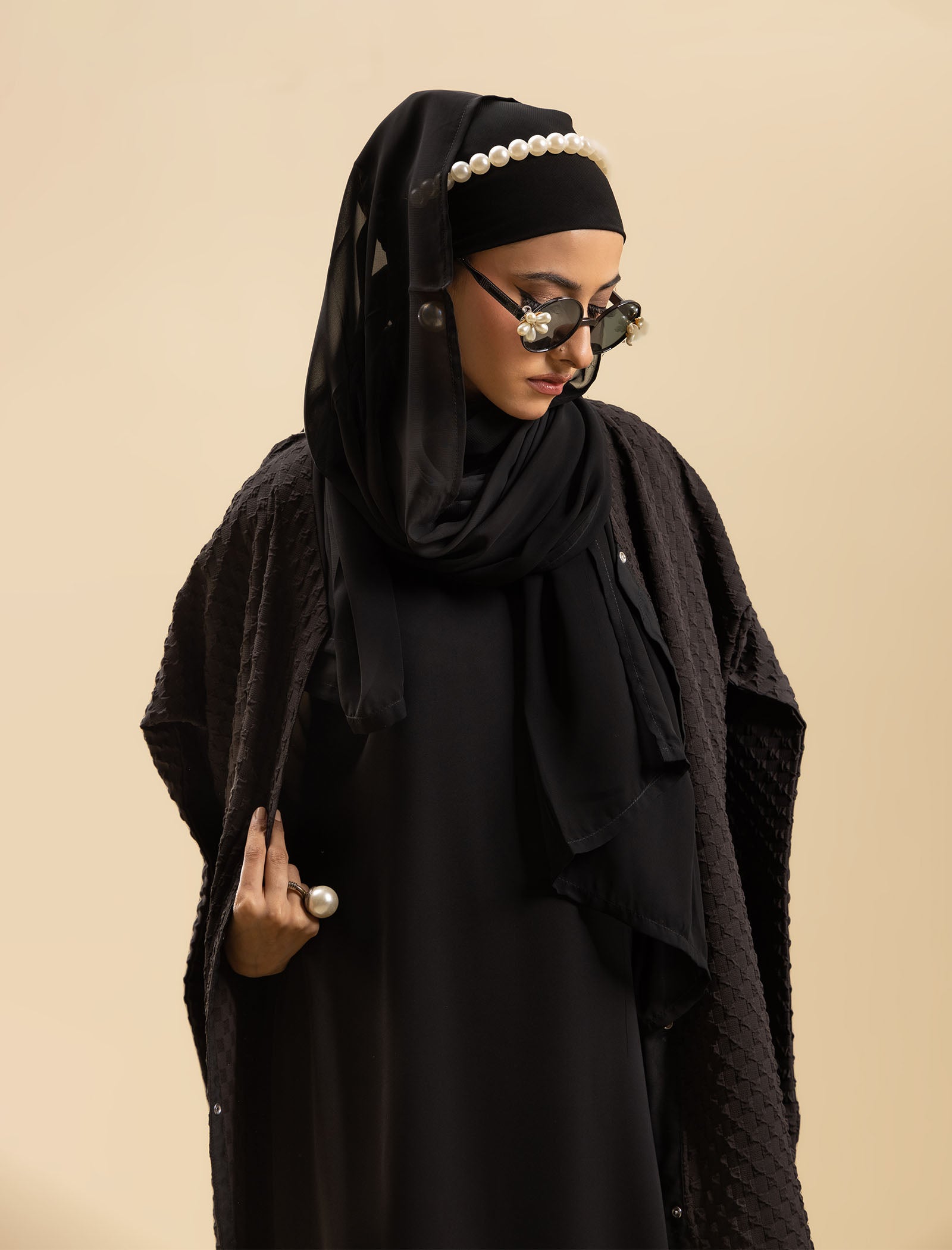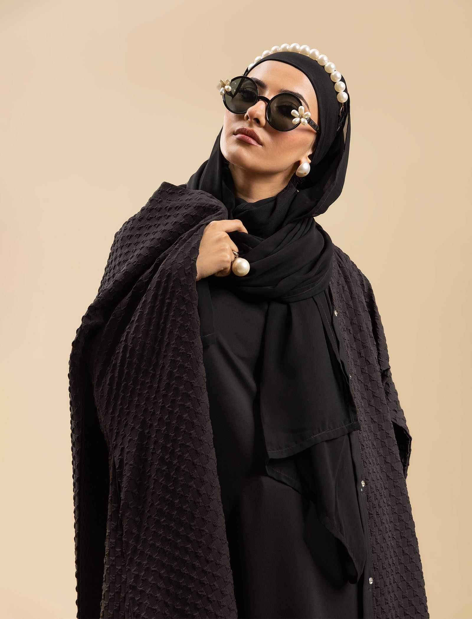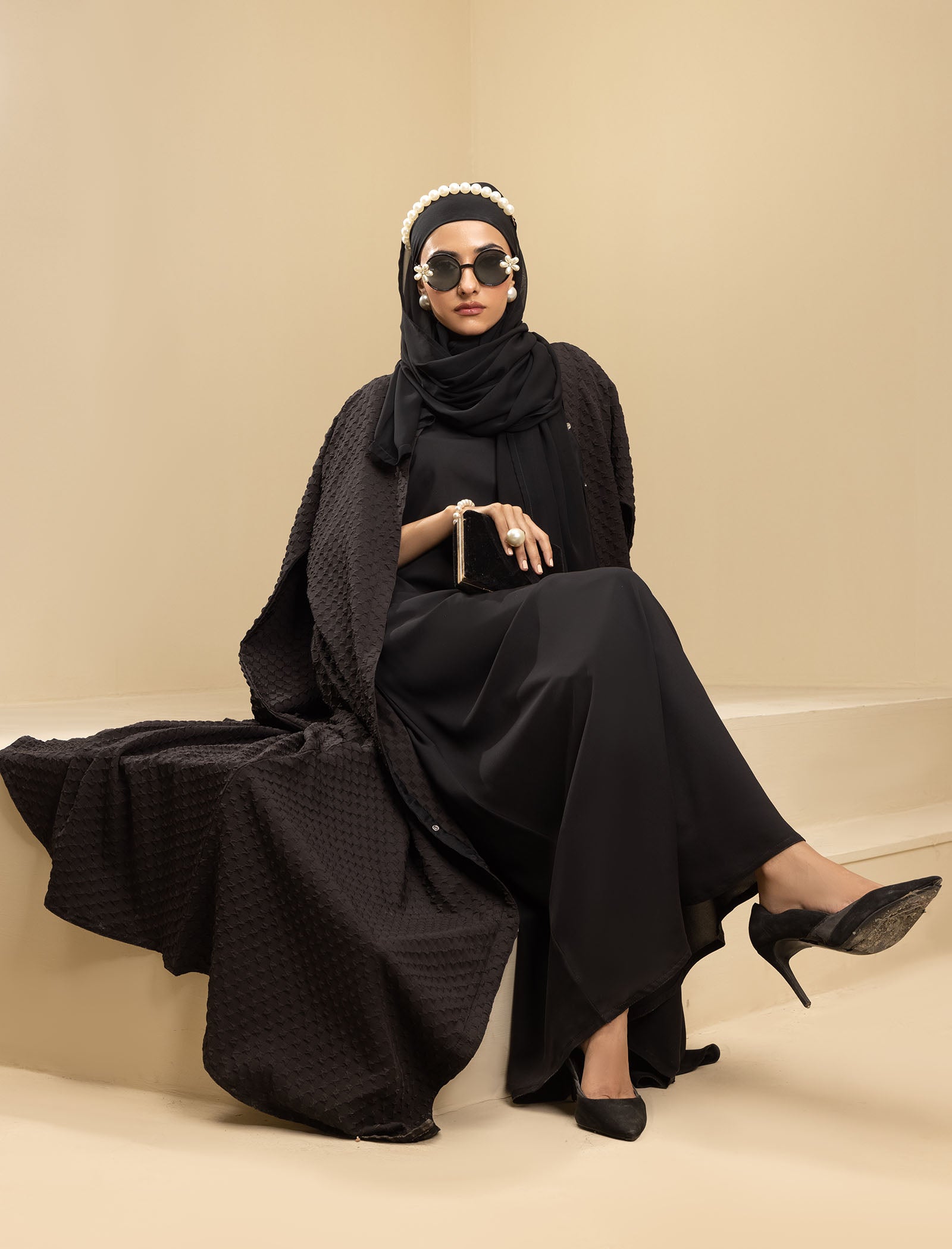 The Night Veil abaya is a limited edition piece, crafted from fancy black fabric that exudes luxury and elegance. The soft, comfortable touch of the fabric has been thoughtfully chosen to offer both style and comfort, making this abaya perfect for any occasion.