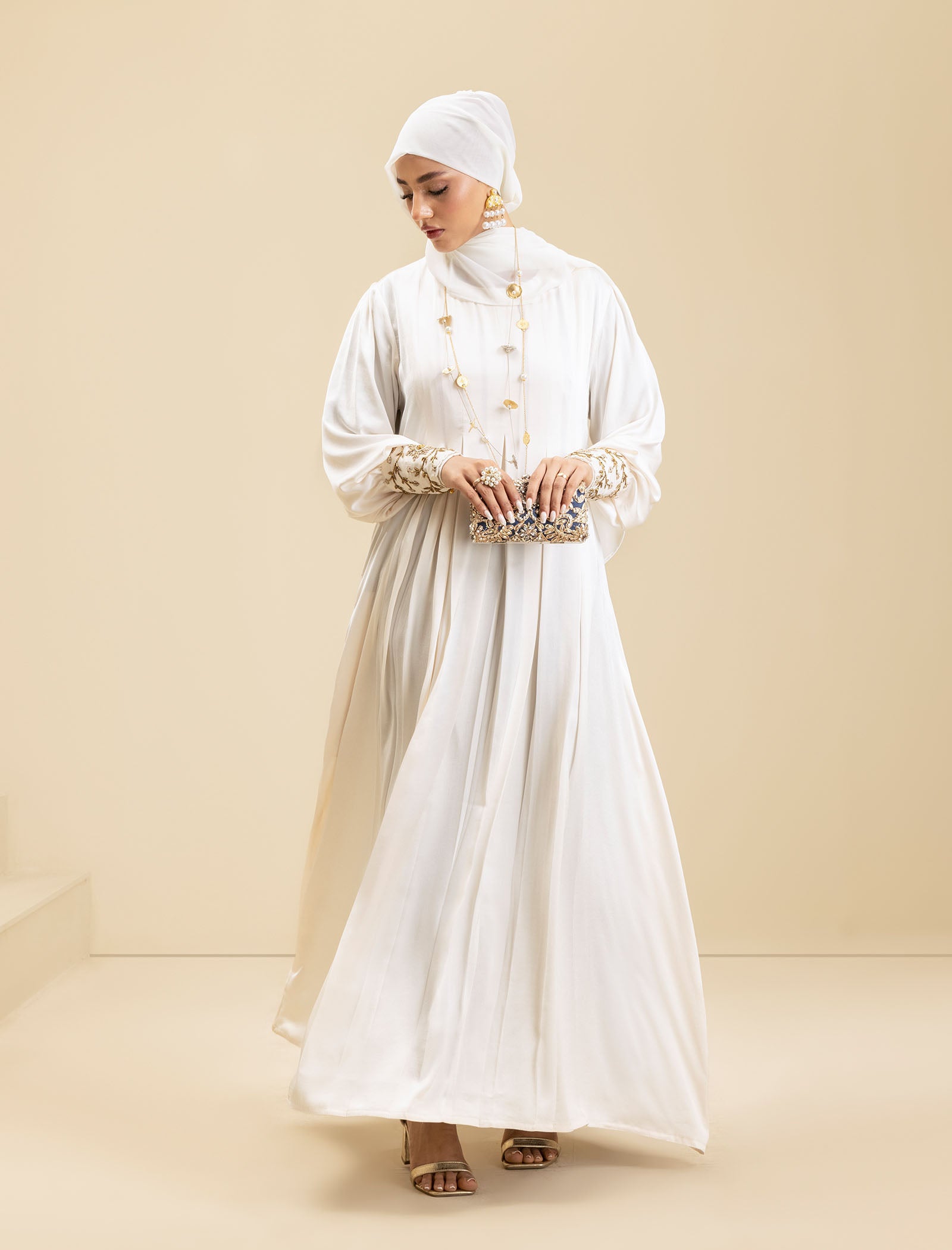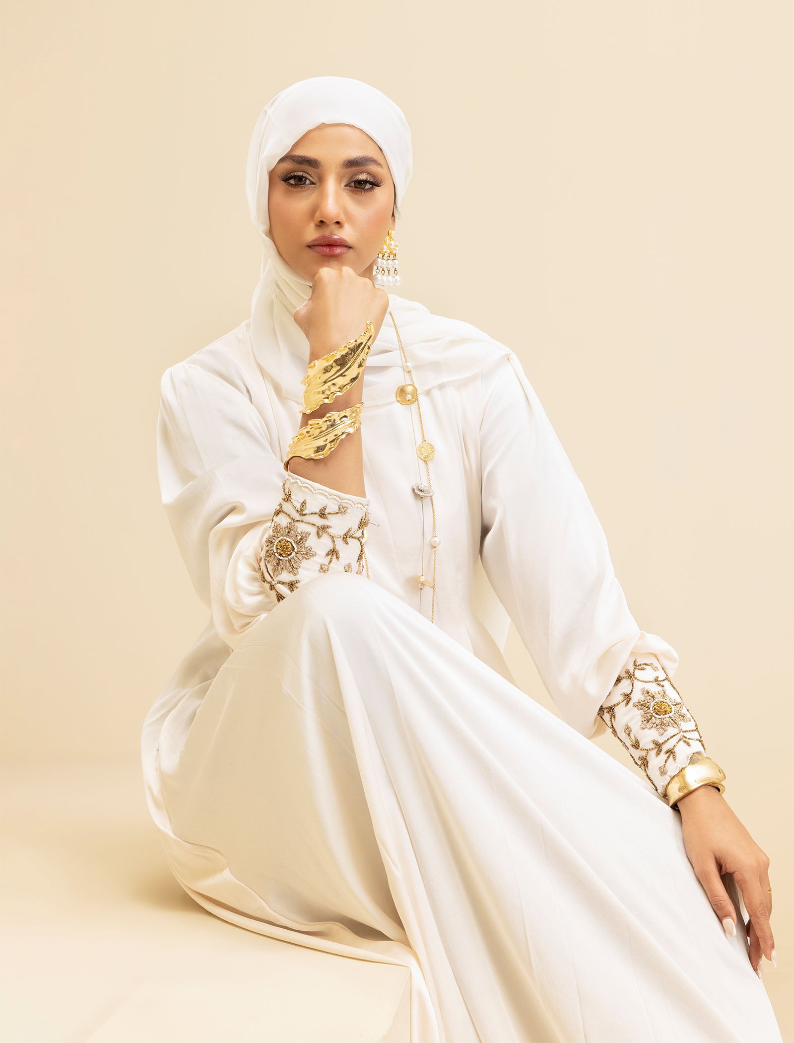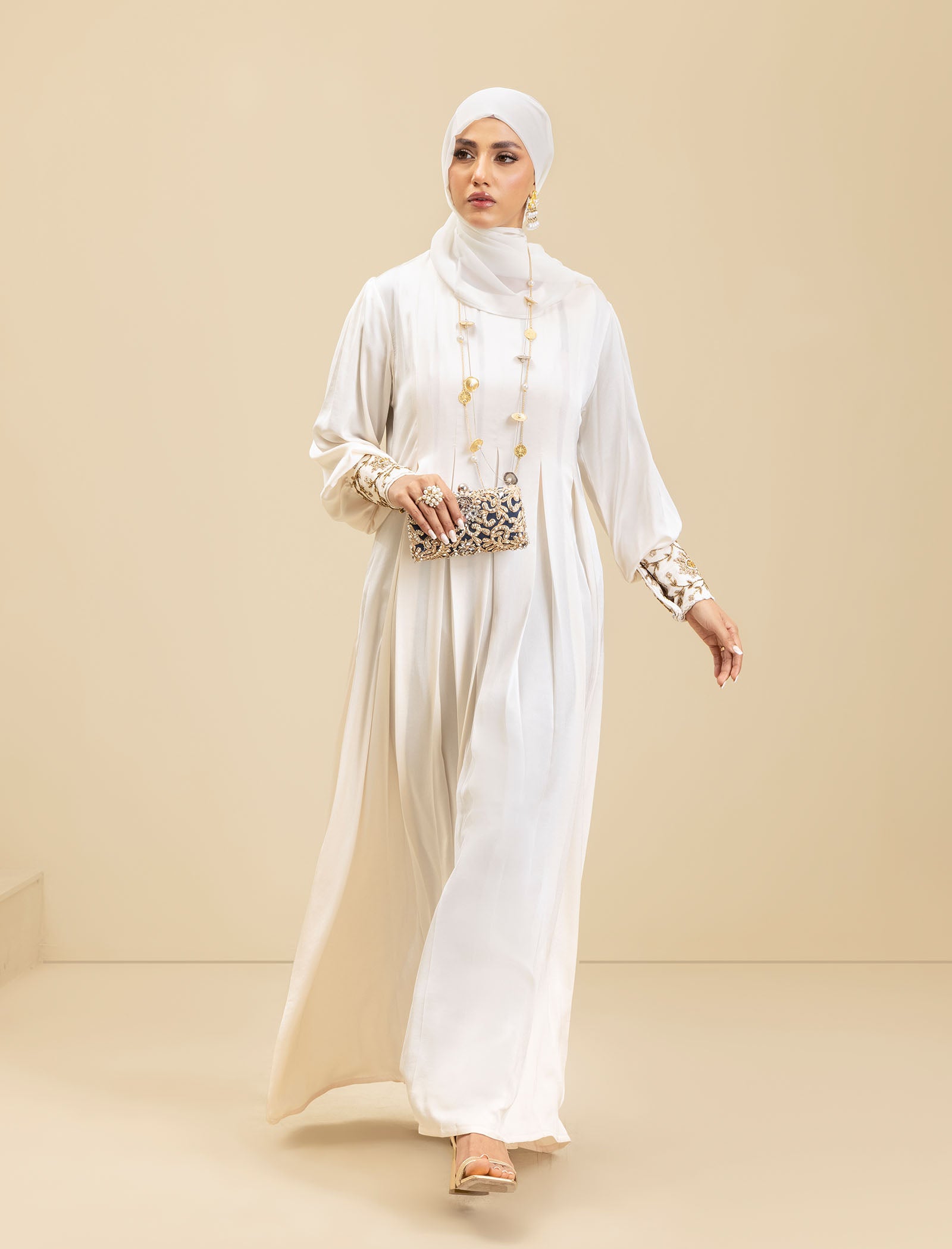The Pure Pearl abaya is crafted from luxury silk, offering a smooth, sophisticated finish. The cream-colored fabric exudes elegance, while the exclusive handwork on the cuffs adds a refined touch, making this abaya a true style statement.