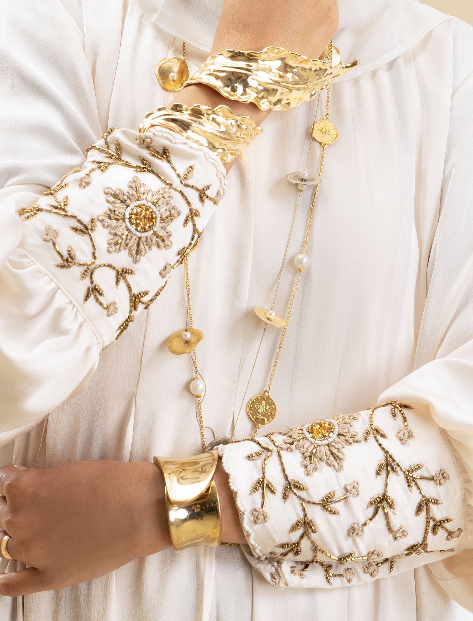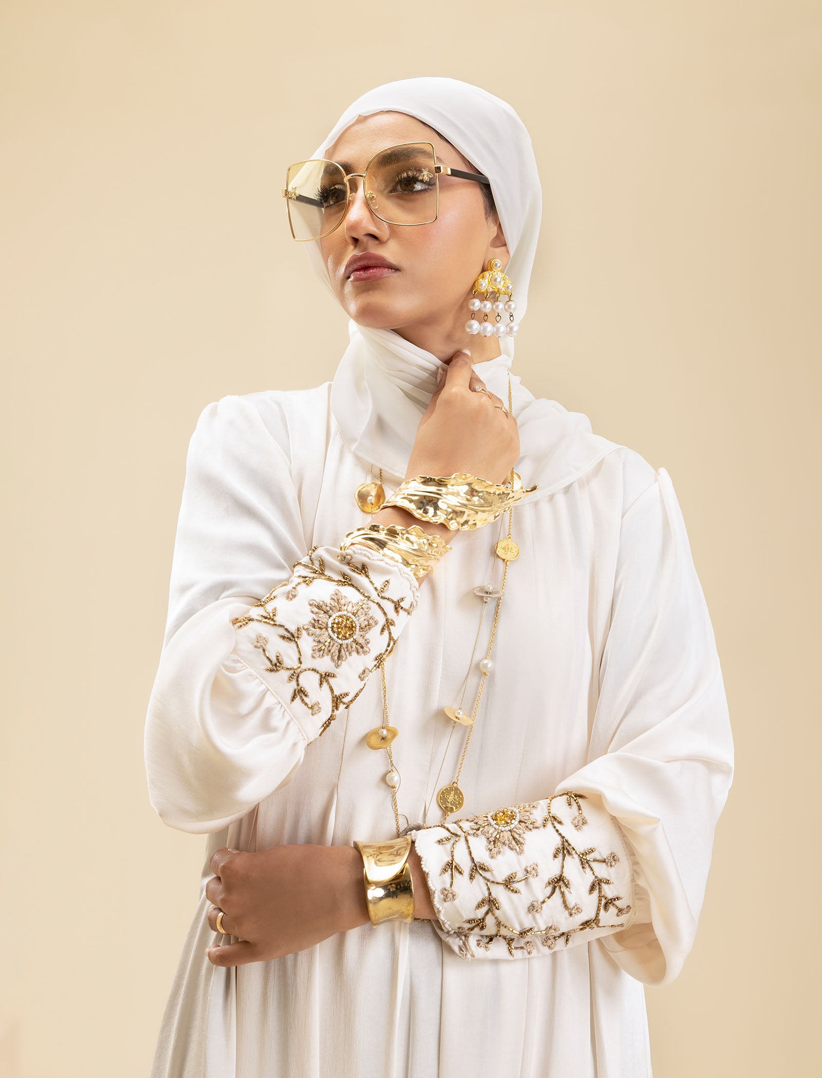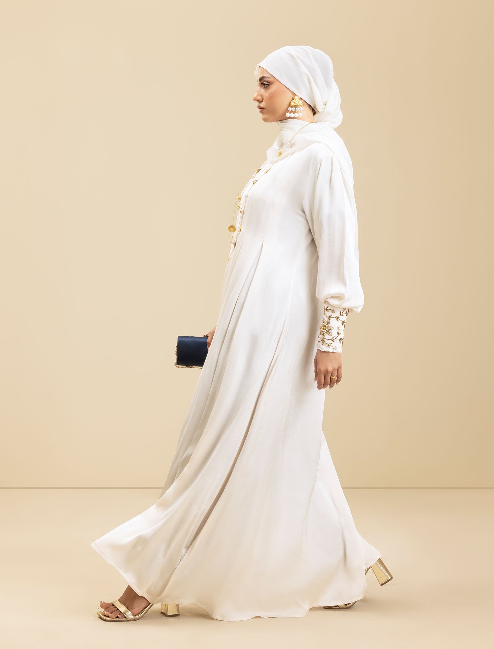 The Pure Pearl abaya is crafted from luxury silk, offering a smooth, sophisticated finish. The cream-colored fabric exudes elegance, while the exclusive handwork on the cuffs adds a refined touch, making this abaya a true style statement.
