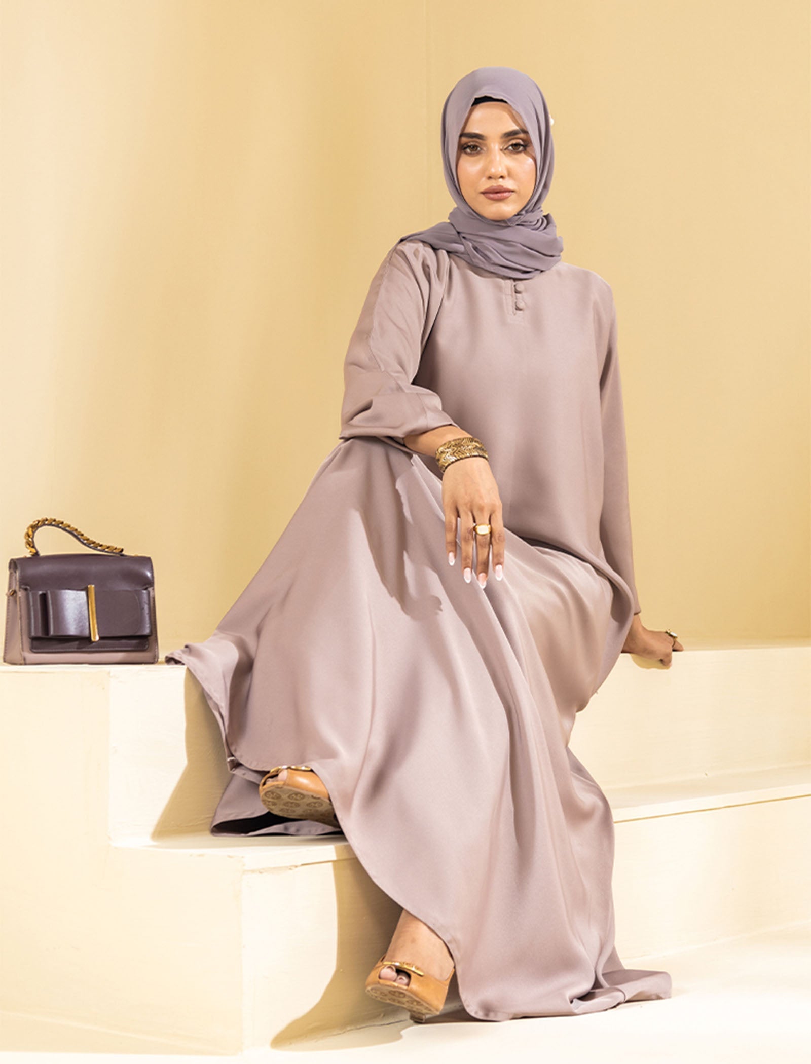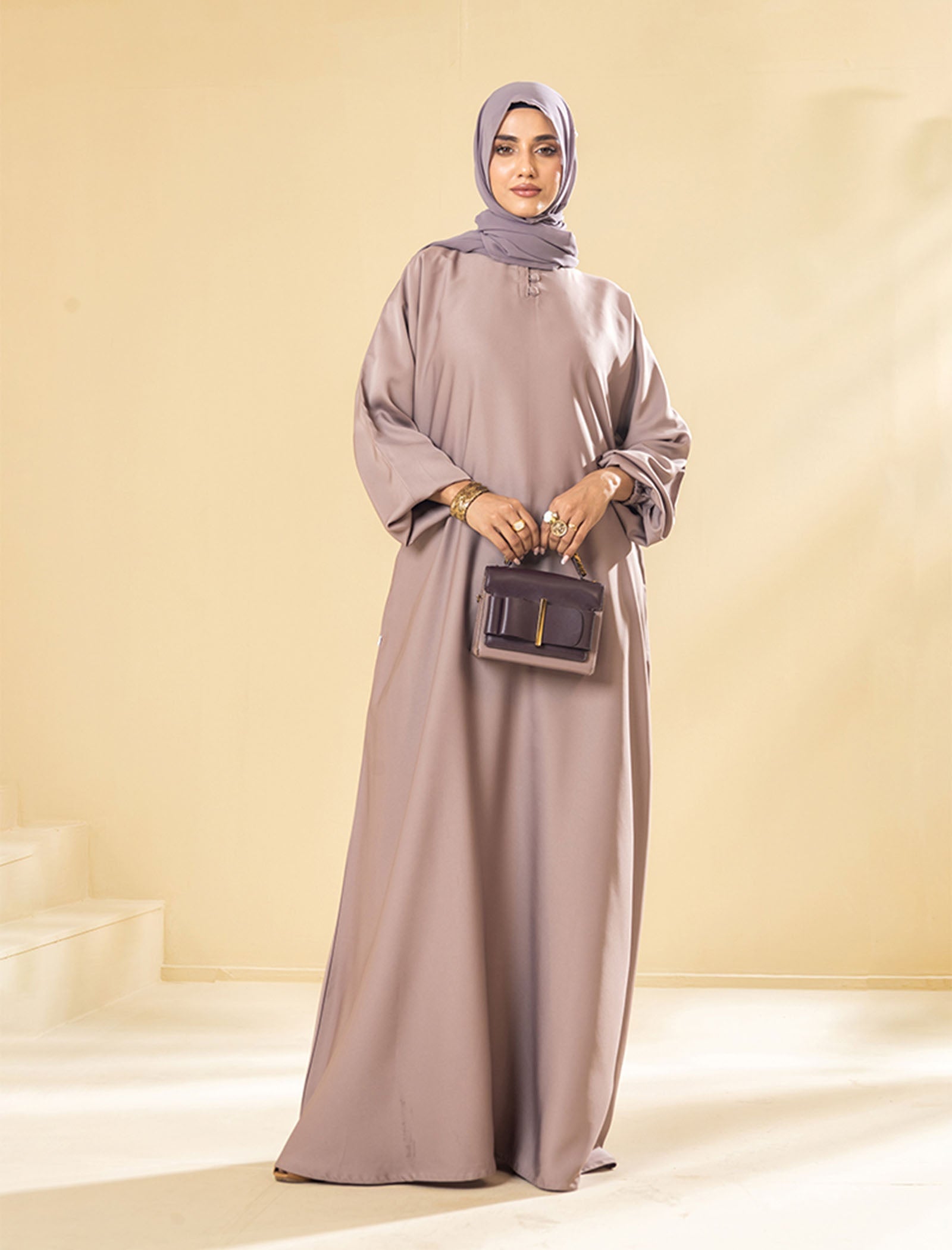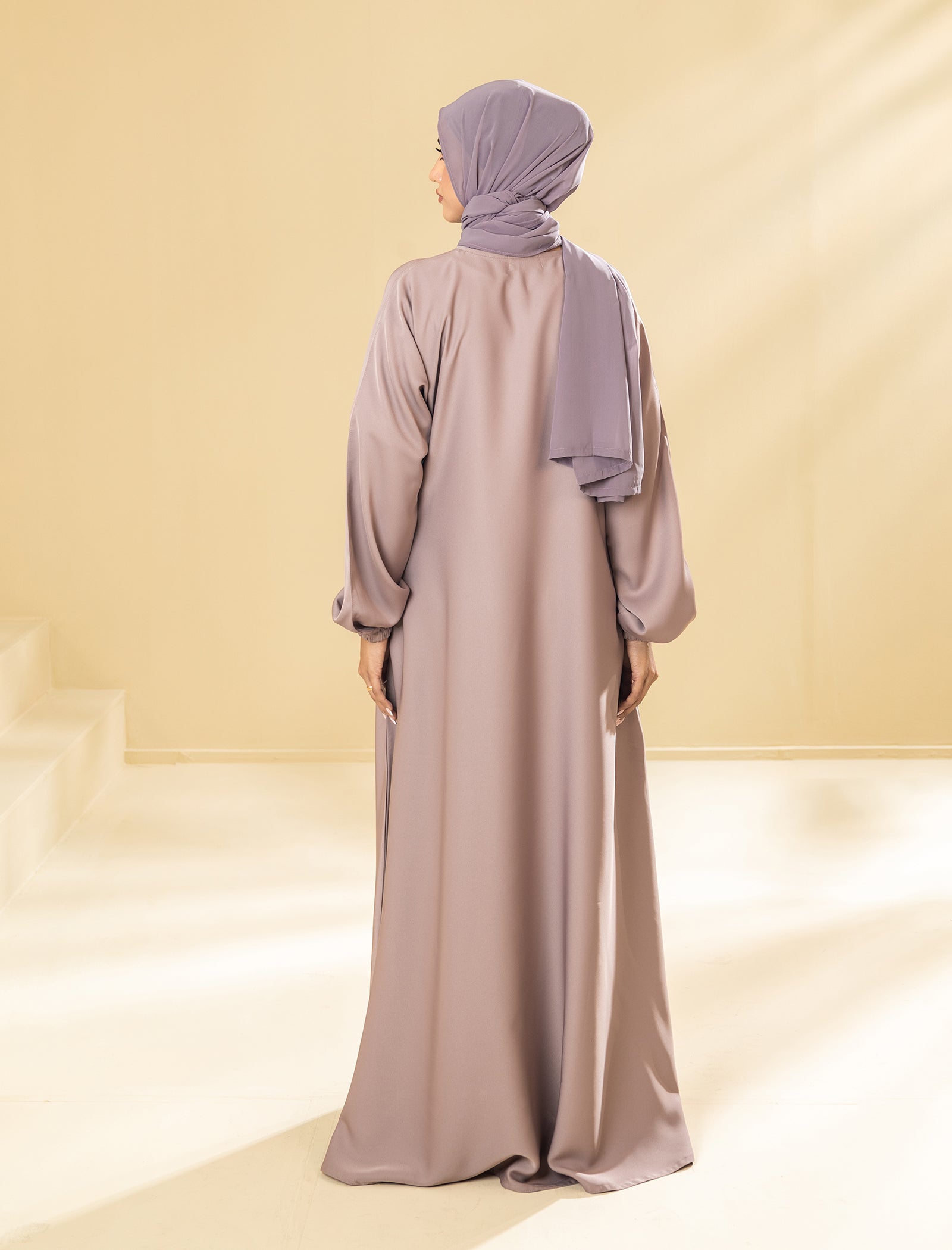 Step into effortless elegance with this beautiful abaya, a perfect blend of comfort and sophistication. Designed in a stunning lilac rose-gold hue, this abaya is ideal for your daily routine, travels, and spiritual journeys like Umrah. Its lightweight fabric and thoughtful features ensure both convenience and modesty in every step you take.