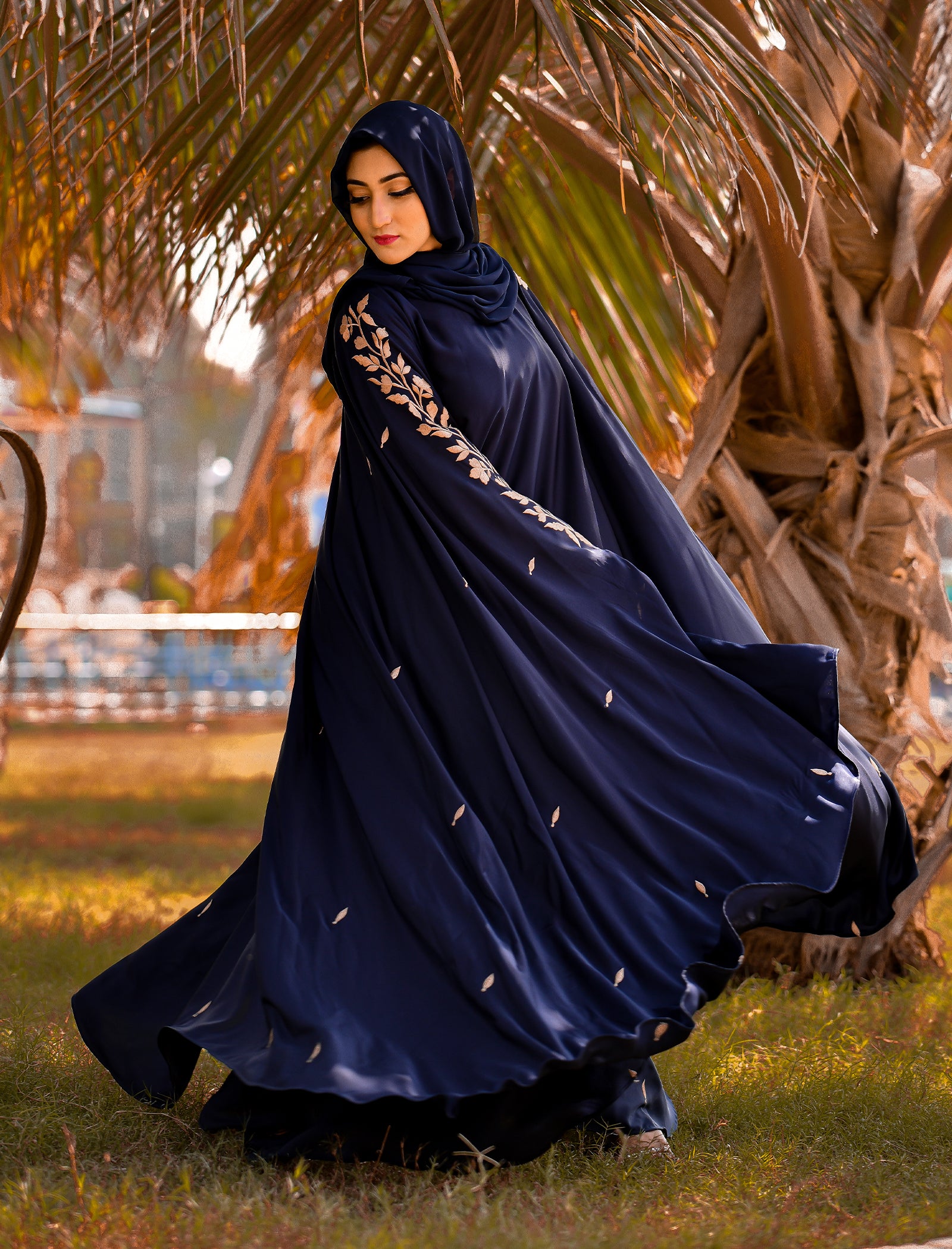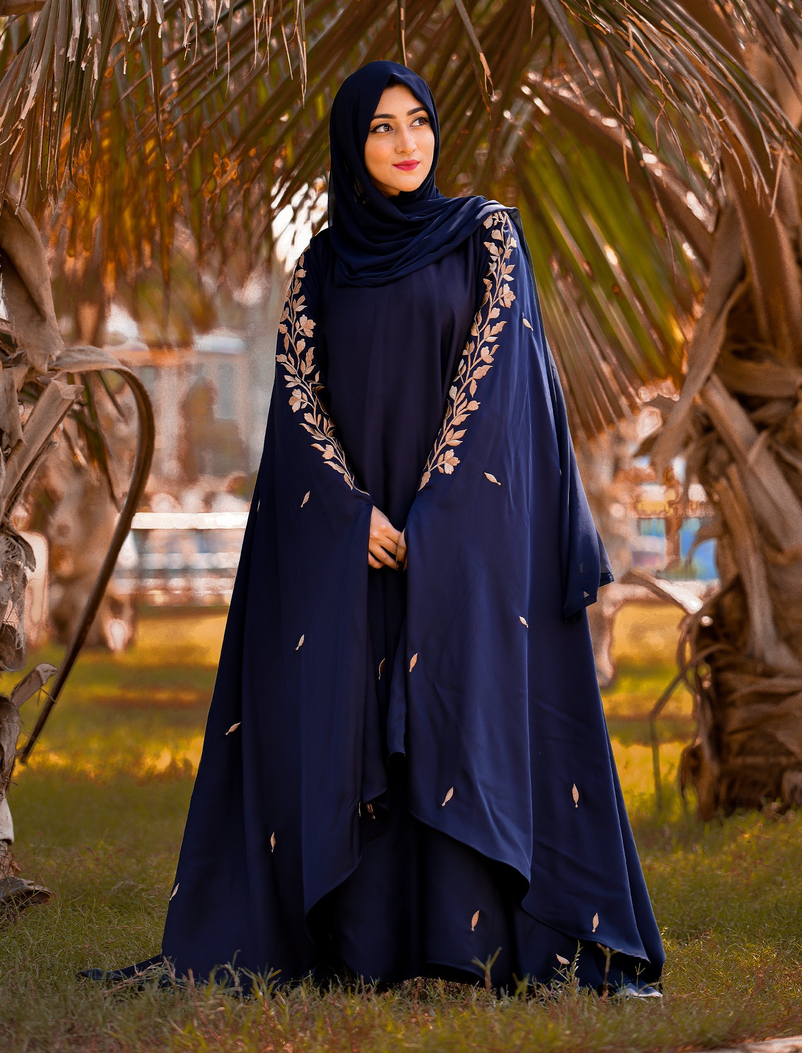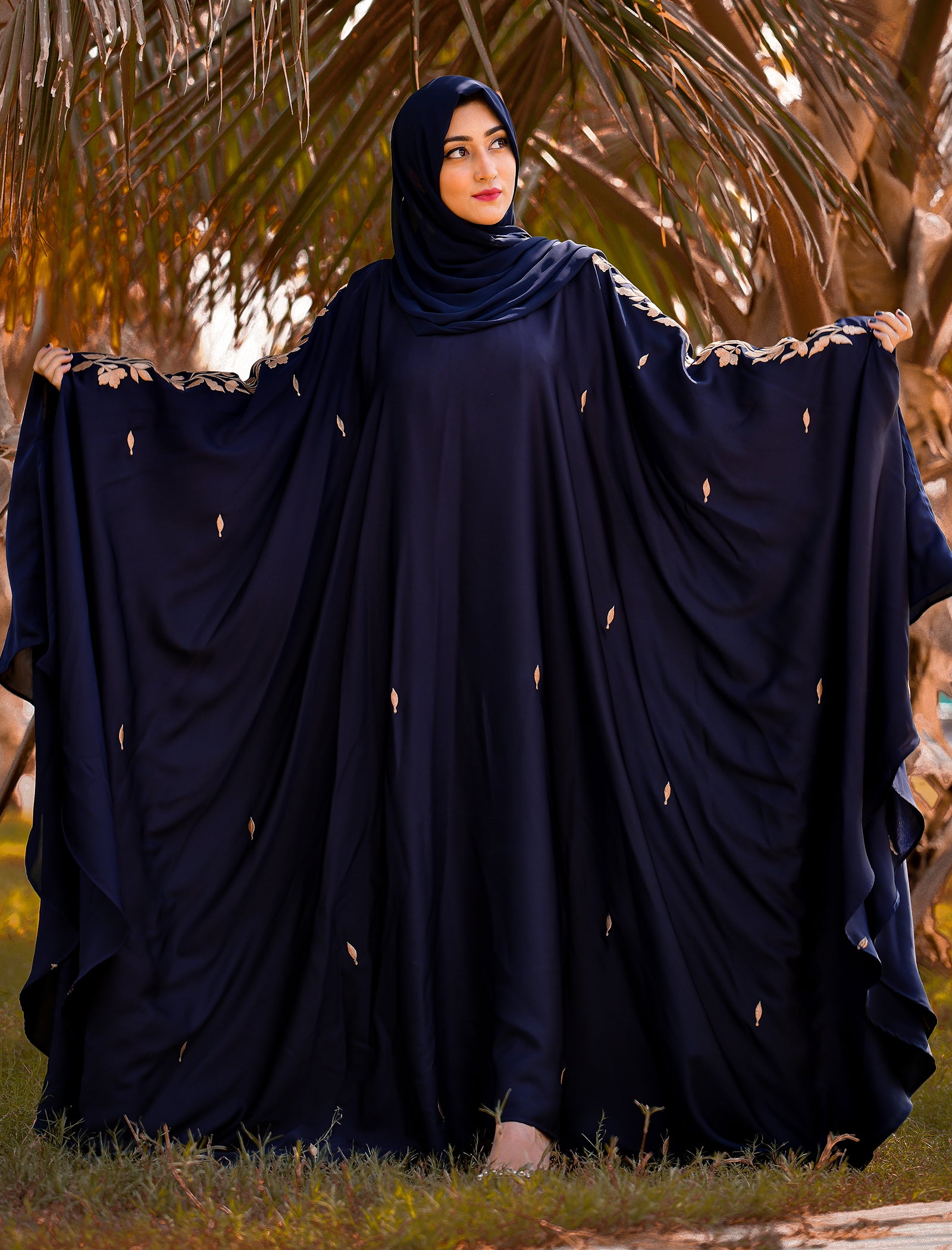 A luxury abaya made of premium quality Nidah Fabric. This abaya has a butterfly style and intricate embroidery from sleeves to shoulder to the neckline.