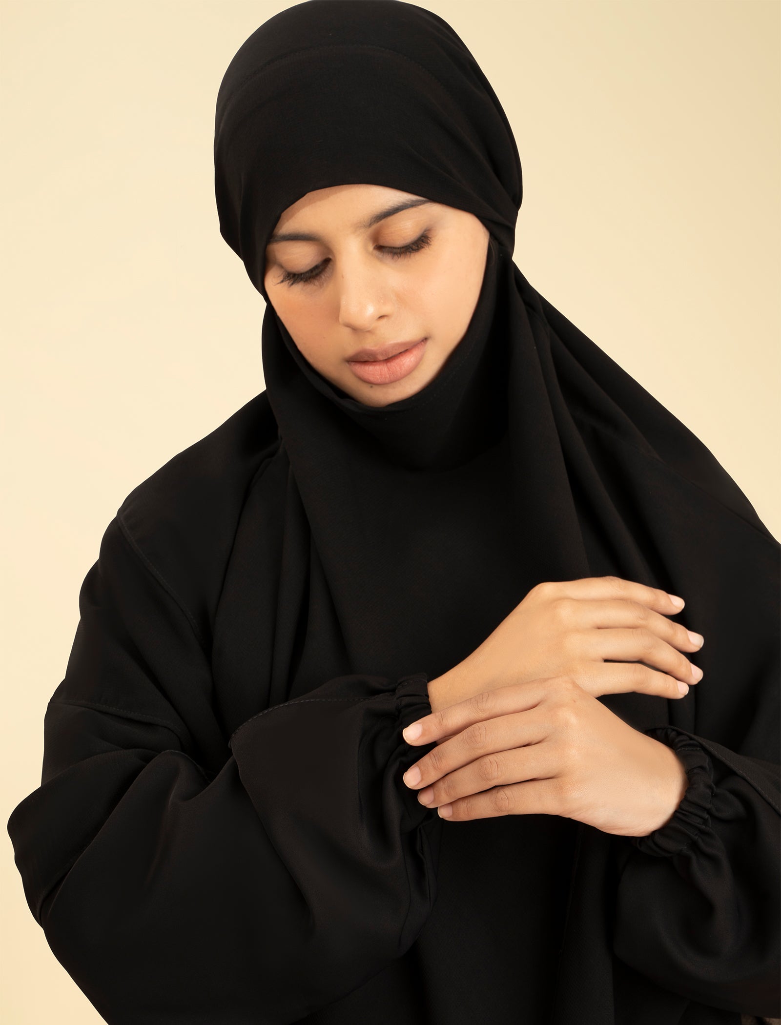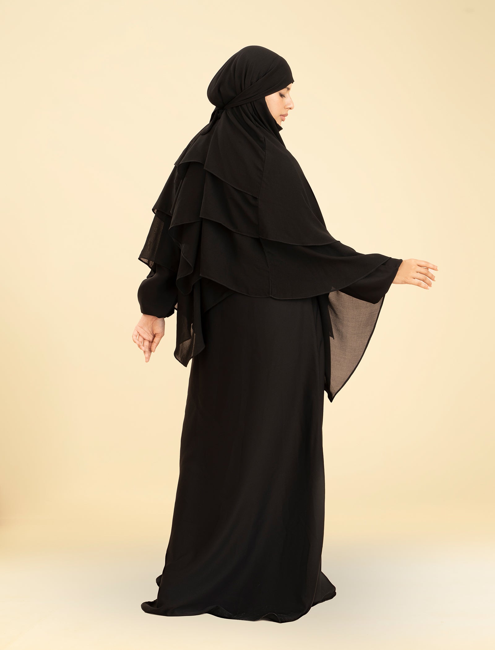 The layered chiffon hijab drapes beautifully, eliminating the need for an additional dupatta. Whether for prayer, daily wear, or Umrah, this set provides full coverage while being lightweight and easy to carry—a perfect blend of utility and elegance.